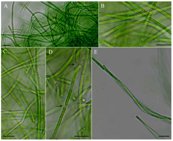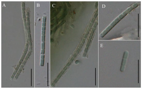Micrographs of Pseudoleptolyngbya wuhanensis LHH-2: (A–D) single trichome; (E) hormogonium. Scale bars = 10 μm.