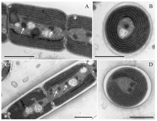 Transmission electron micrograph of the strain Neoleptolyngbya gaoqiuensis GQSK-2 and Neoleptolyngbya chanbaensis CB-4: (A) longitudinal section of a trichome in Neoleptolyngbya gaoqiuensis GQSK-2; (B) cross section of the cell in Neoleptolyngbya gaoqiuensis GQSK-2; (C) longitudinal section of a filament in Neoleptolyngbya chanbaensis CB-4; (D) cross section of the cell in Neoleptolyngbya chanbaensis CB-4. Arrows indicate granule. Scale bar = 1 μm.