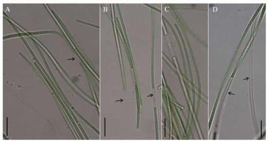 Micrographs of Neoleptolyngbya chanbaensis CB-4: (A–D) filaments. Arrows indicate sheath. Scale bars = 10 μm.