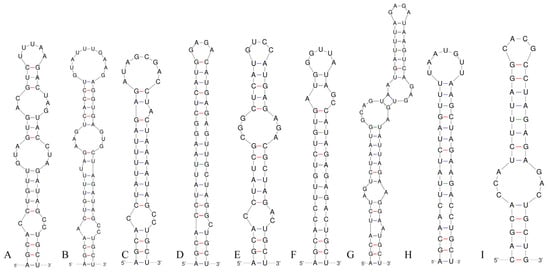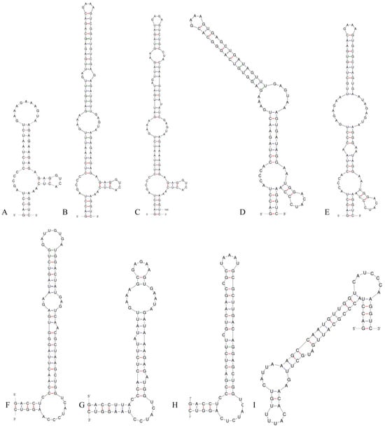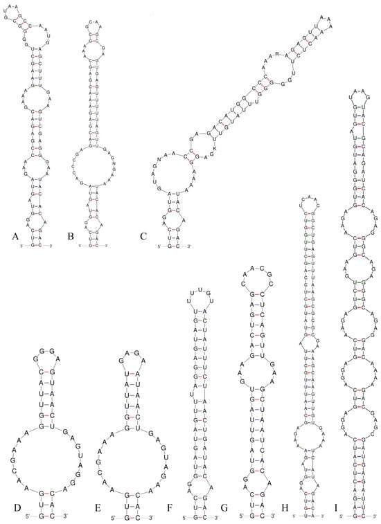 Box–B helices of the 16S–23S ITS for the studied strains and comparison taxa: (A) Pseudoleptolyngbya wuhanensis LHH-2; (B) Pseudoleptolyngbya figueirensis LEGE 16533; (C) Pseudoleptolyngbya monchiquensis LEGE 16651; (D) Neoleptolyngbya chanbaensis CB-4; (E) Neoleptolyngbya gaoqiuensis GQSK-2; (F) Leptolyngbyopsis coimbrensis LEGE 16524; (G) Limnolyngbya circumcreta CHAB4449; (H) Chroakolemma opacum strain 701; (I) Stenomitos rutilans HA7619-LM2.