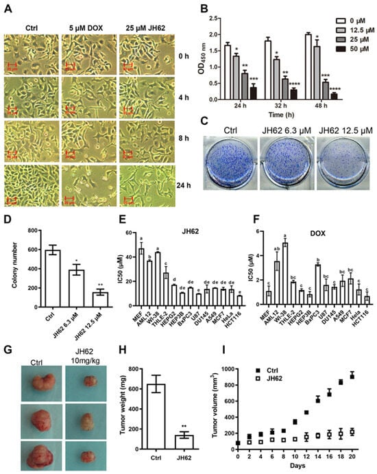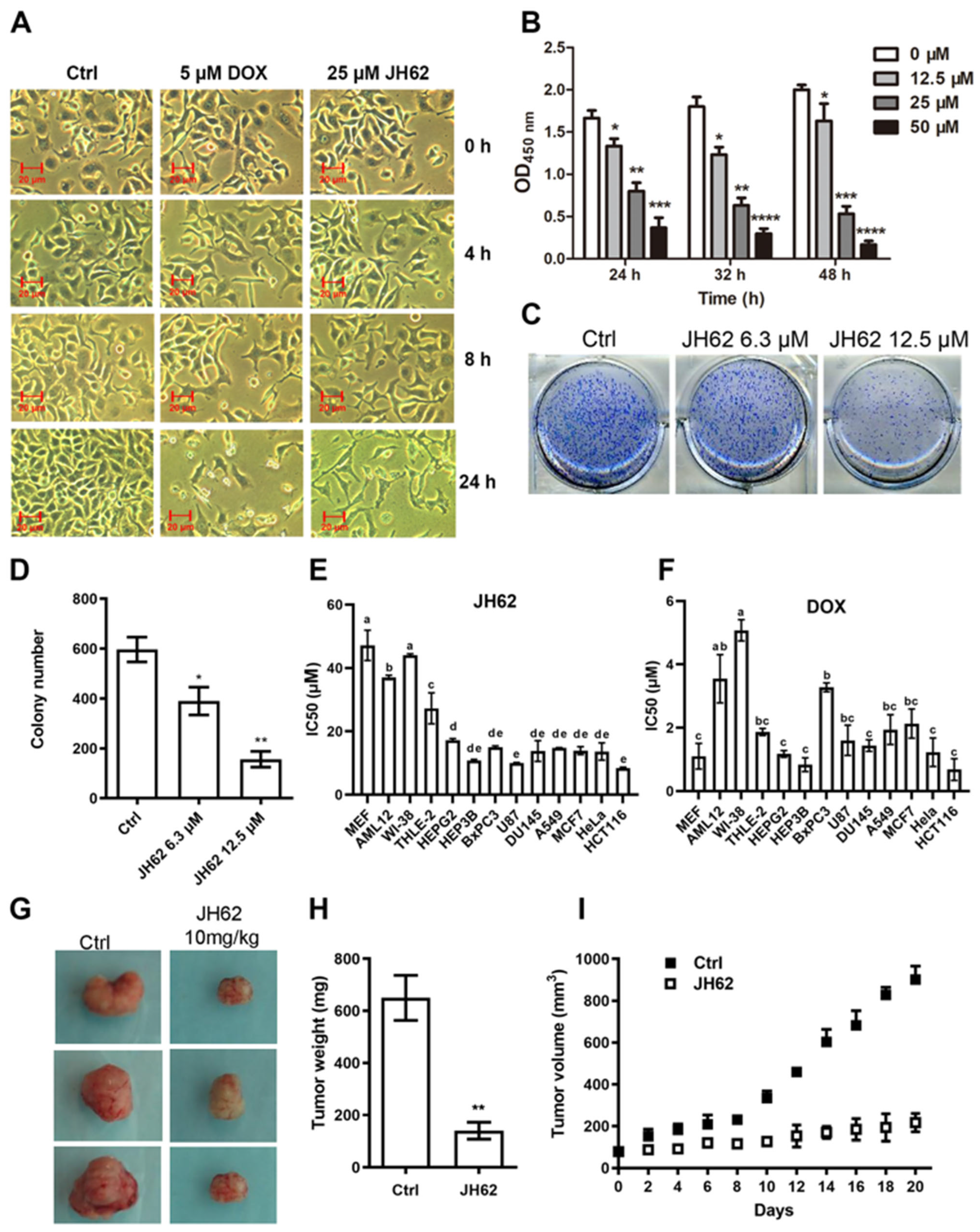 Cell viability was assessed using the WST-1 assay, based on a previously reported method with slight modifications [54]. Briefly, cells were seeded at 1 × 104 cells per well in 96-well plates and then treated with different doses of JH62 or DOX for 0–72 h. The cells used included non-cancer cells (MEF, AML12, WI-38, and THLE-2) and cancer cells (A549, HEPG2, HEP3B, BxPC3, U87, DU145, MCF7, HeLa, and HCT116). The WST-1 reagent (Roche, Shanghai, China) was added to each well (10% vol/vol final concentration), followed by incubation for 3 h at 37 °C. Absorbance at OD450 was measured using a microplate reader (Synergy H1; BioTek Instruments, Winooski, VT, USA).