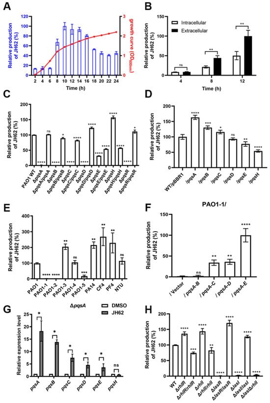 The biosynthetic pathway of JH62, a previously uncharacterized quinolone in Pa, was investigated. Time–course analysis by liquid chromatography-mass spectrometry (LC-MS) revealed that extracellular JH62 production correlated with bacterial density, peaking during the mid- to late-logarithmic growth phase (~10 h; Figure 5A). Furthermore, 66.5% of total JH62 was detected in the culture supernatant, with the remaining 33.5% associated with the cell pellet, indicating active secretion (Figure 5B).