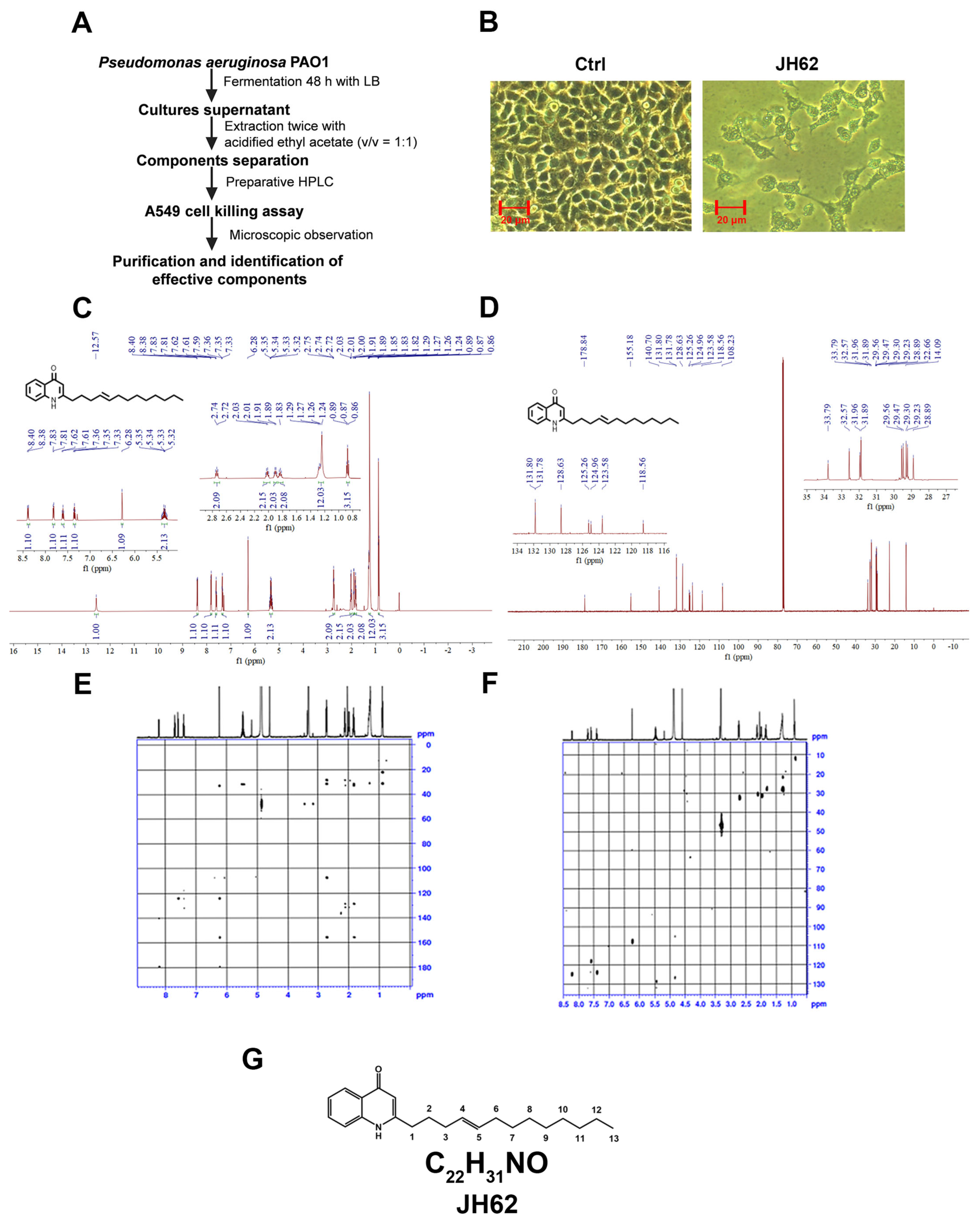 Prompted by the finding that Pa is capable of inducing apoptosis and necrosis in several cancer cell lines [64], we screened for small molecules with anticancer activity using A549 lung cancer cells, following the procedure outlined in Figure 1A. Pa PAO1 was cultured in LB medium for 48 h prior to extraction using acidified ethyl acetate. Crude extracts were separated through preparative HPLC, and 15 mL fractions were collected at 5 min intervals. The fractions were appropriately diluted and added to A549 cells growing in a 96-well plate. Cell viability was monitored daily by microscopy to identify fractions exhibiting cytotoxic activity. One active fraction, designated JH62, consistently inhibited the growth and proliferation of A549 cells. Microscopic examination showed that A549 cells treated with the JH62 crude fraction showed reduced adherence and failed to form a confluent monolayer (Figure 1B).