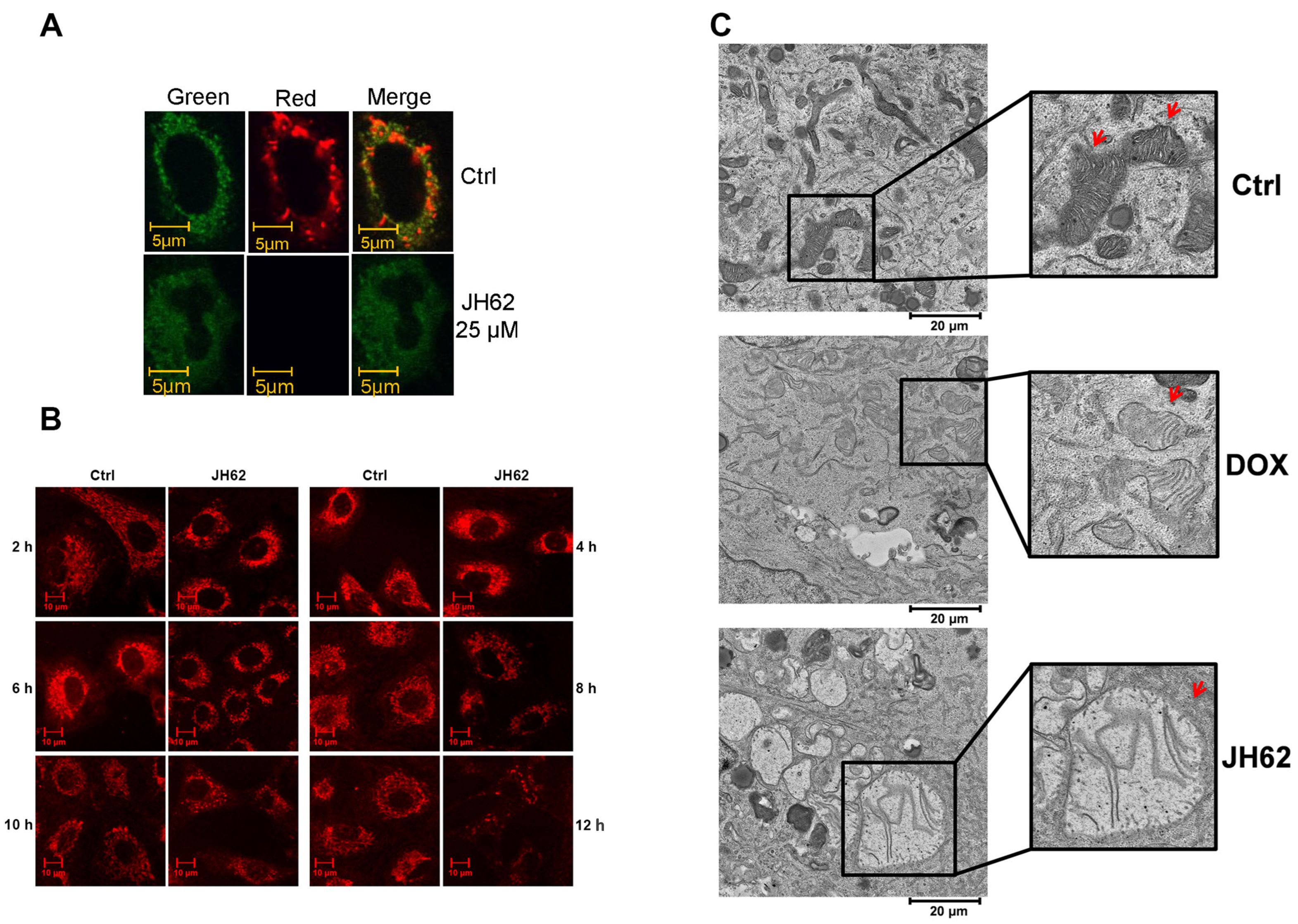 Mitochondrial membrane potential and mitochondria localization were assessed by JC-1 and MitoTracker staining based on previously published methods [57]. A549 cells were cultured at 37 °C and 5% CO2 in Dulbecco’s modified Eagle’s medium (DMEM), supplemented with 10% heat-inactivated FBS (Thermo Fisher Scientific, Waltham, MA, USA) and L-Glutamine (Thermo Fisher Scientific, Waltham, MA, USA) (2 mM). An aliquot of 1 mL of JH62 (25 μM) solution was added to the cell cultures. For JC-1 staining, cells grown in 24-well plates were treated as indicated for 12 h, washed with PBS, incubated with JC-1 solution according to the manufacturer’s instructions for 10 min at 37 °C, and then washed again. Cells were washed with dilution buffer, and photos were taken using a microscope. For MitoTracker staining, cells grown on 12 mm diameter round glass coverslips in 24-well plates were incubated with MitoTracker Red diluted 1:2000 or 1:20,000 from a stock solution (1 mM) in culture medium for 45 min at 37 °C. Cells were then washed with PBS and fixed with ice-cold 3.2% paraformaldehyde in PBS for 20 min at room temperature. After washing, coverslips were mounted on glass slides using an appropriate mounting medium. Photos were taken using a microscope.