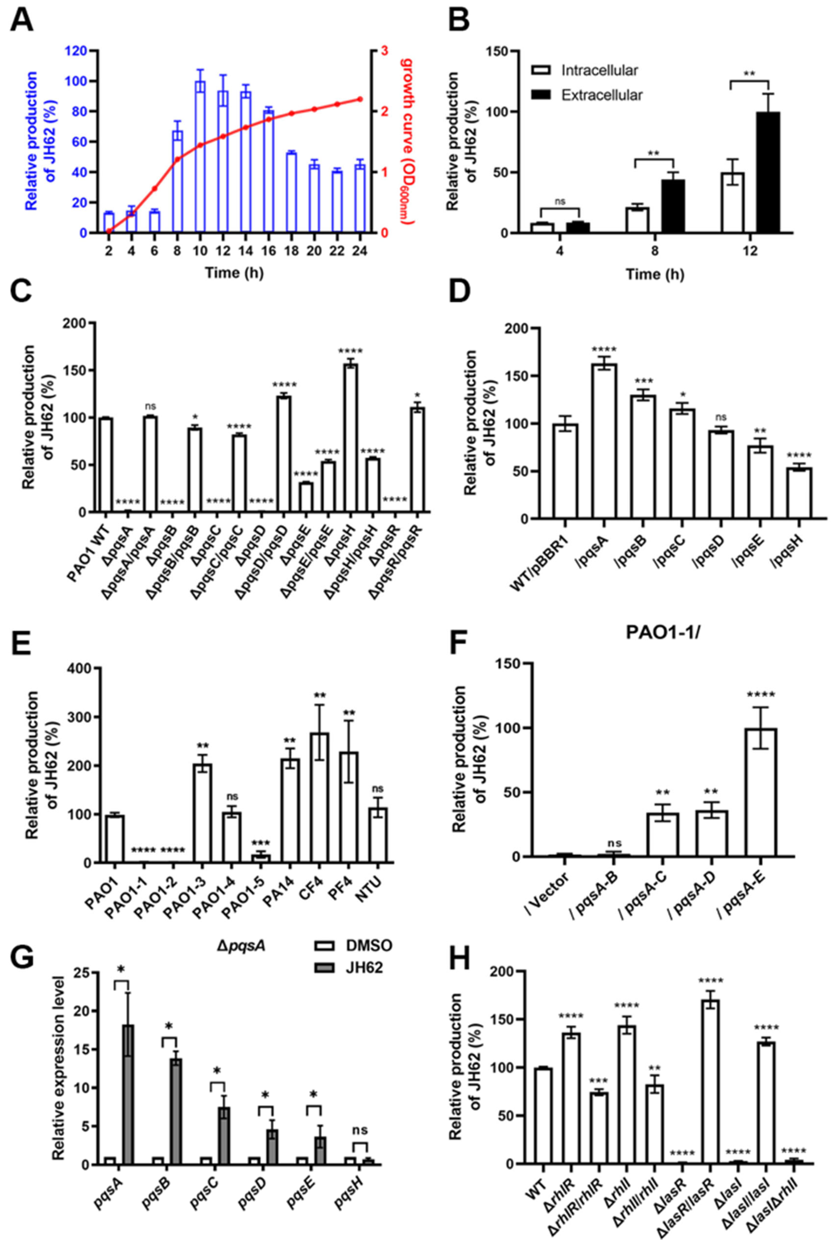 Since the pqs gene cluster is responsible for JH62 biosynthesis, we determined whether JH62 itself could regulate the expression of this cluster, potentially establishing a feedback loop. To this end, we supplemented the JH62-deficient ΔpqsA mutant with exogenous JH62 and assessed the pqs cluster transcription. The results demonstrate that JH62 markedly upregulated the transcription of pqsA, pqsB, pqsC, pqsD, and pqsE, while leaving pqsH transcription unaffected, indicating a positive feedback loop that amplifies its production (Figure 5G).