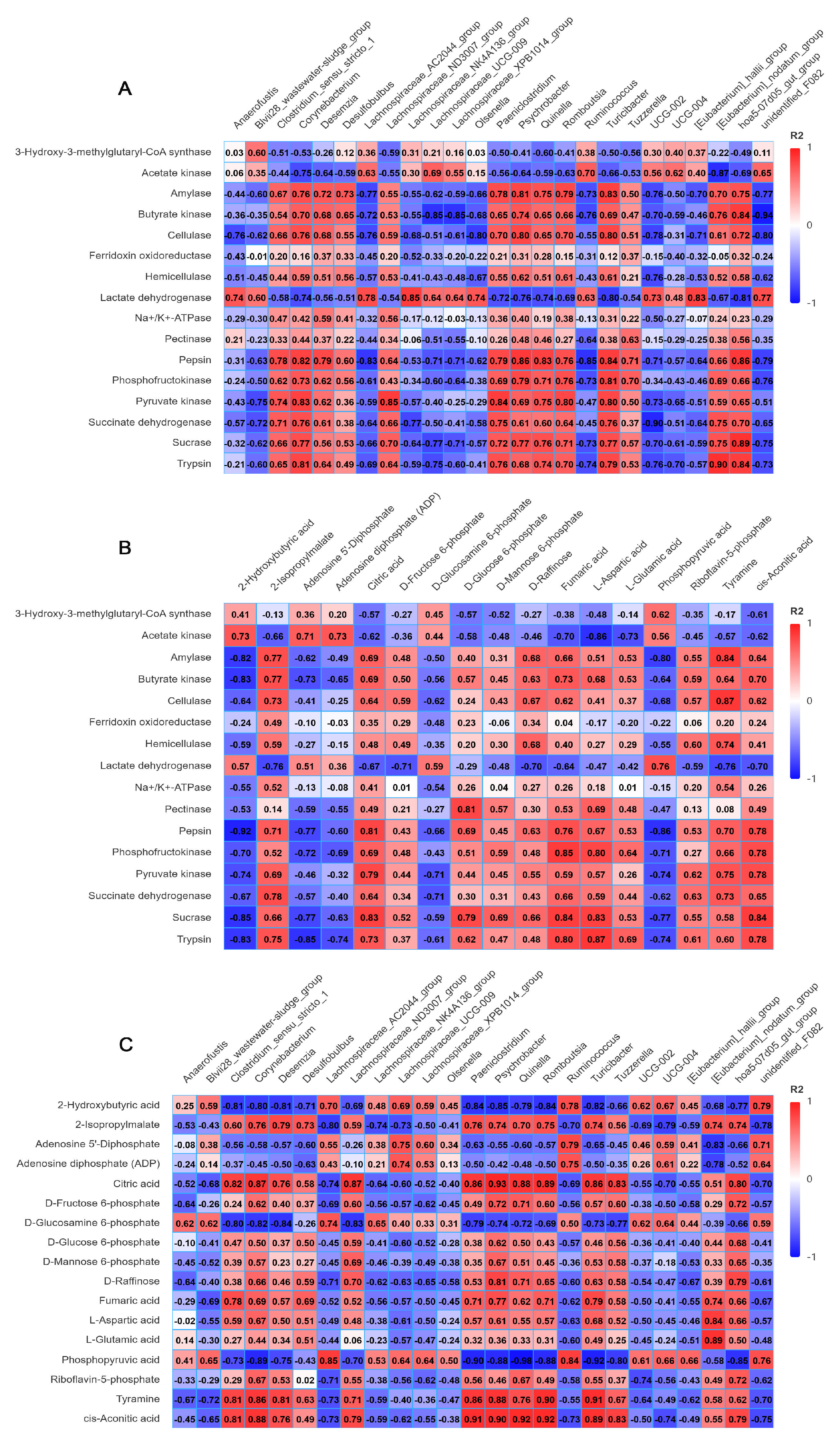 3.6. Correlation Analysis of Microbiota, Enzyme Activities and Metabolites in Rumen Fluid