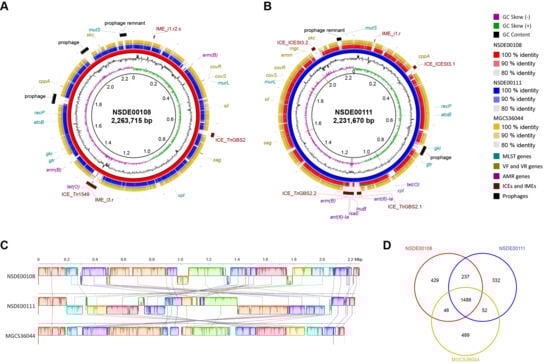 - Cinthi, M.; Massacci, F.R.; Coccitto, S.N.; Albini, E.; Cucco, L.; Orsini, M.; Simoni, S.; Giovanetti, E.; Brenciani, A.; Magistrali, C.F. Characterization of a prophage and a defective integrative conjugative element carrying the optrA gene in linezolid-resistant Streptococcus dysgalactiae subsp. equisimilis isolates from pigs, Italy. J. Antimicrob. Chemother. 2023, 78, 1740–1747. [Google Scholar] [CrossRef] [PubMed]