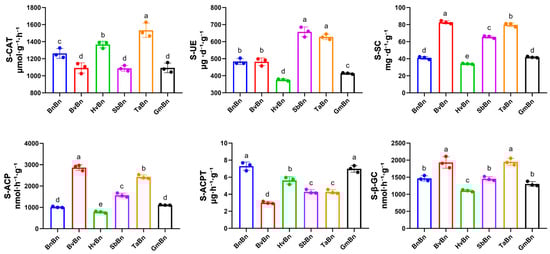 To determine enzyme activity, soil samples must be air-dried and ground, with the dry weight of the soil serving as the basis for measurement. Various kits were employed to measure soil urease (S-UE), soil sucrase/acid invertase (S-SC), soil acid phosphatase (S-ACP), soil acid protease (S-ACPT), soil β-glucosidase (S-β-GC or S-GC), and soil catalase (S-CAT). The corresponding kit numbers are as follows: S-UE (G0301F), S-SC (G0302F), S-ACP (G0304F), S-ACPT (G0316F), S-β-GC (G0312F), and S-CAT (G0303F). All kits were procured from Suzhou Greys Biotechnology Co., Ltd. (Suzhou, China). The enzyme activity of the samples was assessed using a microplate method with a microplate reader (SpectraMax iD3, Molecular Devices, Shanghai, China).