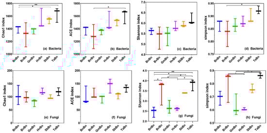Microbial diversity and abundance in different treatments. Chao1 (a), ACE (b), Shannon (c), and Simpson (d) are indices of alpha diversity in bacteria; Chao1 (e), ACE (f), Shannon (g), and Simpson (h) are indices of alpha diversity in fungi. Data were analyzed utilizing Microsoft Excel 2021, alongside IBM SPSS Statistics 26. * p = 0.05 and ** p = 0.01.