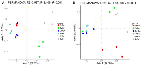 Principal component analysis (PCoA) of bacteria (A) and fungi (B) under different preceding crops. The horizontal axis denotes the first principal coordinate, with the percentage shown in parentheses indicating the contribution rate of this coordinate to the variation among samples; the vertical axis indicates the second principal coordinate, and the percentage in parentheses reflects the contribution rate of the second principal coordinate to the sample variation.