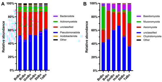 Across all six patterns, Pseudomonadota was the overwhelmingly dominant phylum, accounting for 45.8–61.6% of the bacterial community (Figure 5A); its relative abundance peaked under TaBn (61.6%) and reached its minimum under BvBn (45.9%). Unclassified bacteria constituted the second-largest fraction, ranging from 25.9% to 41.1%, with the highest value recorded in BvBn (41.1%) and the lowest in TaBn (26.0%). Actinomycetota showed little variation among treatments, fluctuating narrowly between 7.4% and 8.8%. The Bacteroidota and Acidobacteriota were present only in minor proportions (<2%); Bacteroidota attained its greatest abundance under SbBn (1.7%), whereas Acidobacteriota declined to its lowest level under TaBn (0.8%). The relative abundance of soil fungal phylum differed markedly among the six patterns (Figure 5B).