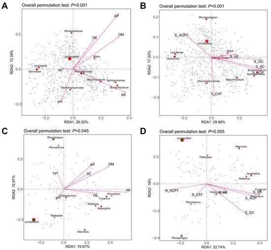 Environmental drivers of soil microbial community composition. Redundancy analysis (RDA) was performed on individual sample bacteria with soil physicochemical properties (A) and enzyme activity (B), as well as on fungal communities with soil physicochemical properties (C) and enzyme activity (D). The direction of the arrows indicates the correlation with the first two canonical axes, while the length of the arrows represents the strength of the correlation.