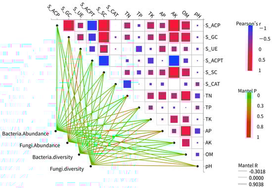 The effects of various environmental factors on the diversity of soil bacterial and fungal communities were assessed using the Mantel test. TN significantly influenced bacterial diversity (r2 = 0.2707, p = 0.049). Additionally, TN (r2 = 0.3766, p = 0.001), total potassium (TK) (r2 = 0.3283, p = 0.023), AK (r2 = 0.2458, p = 0.032), and S_ACP (r2 = 0.2274, p = 0.034) all significantly impacted bacterial abundance. Furthermore, TN (r2 = 0.2732, p = 0.026) and OM (r2 = 0.2456, p = 0.027) significantly affected fungal abundance, while S_UE (r2 = 0.2659, p = 0.01) and TP (r2 = 0.4948, p = 0.002) significantly influenced fungal diversity (Figure 8).