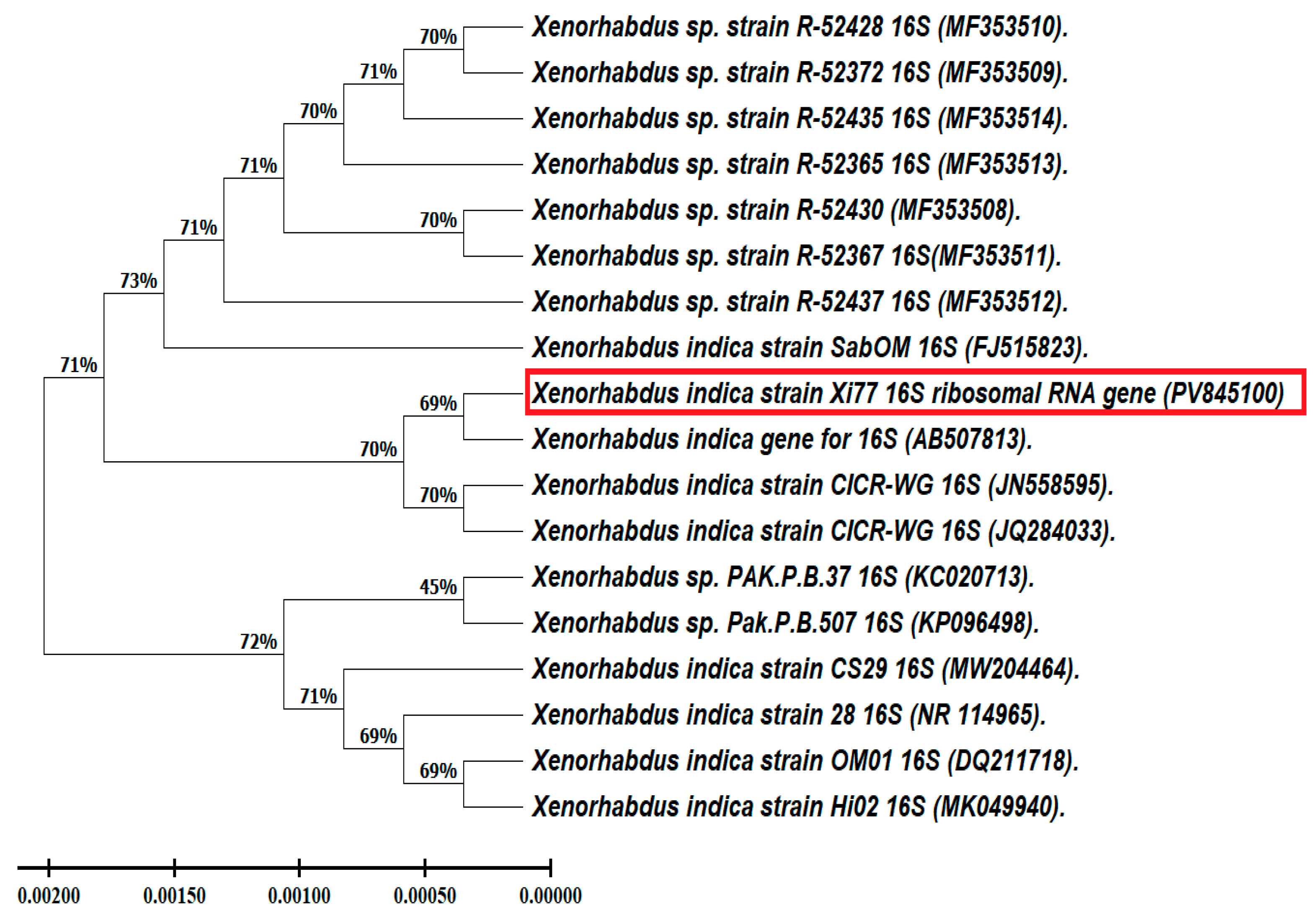 Based on morphological features like color and spore shape, the bacterial isolate was initially identified. Amplification and sequencing of bacterial rRNA genes resulted in a 1530 bp nucleotide sequence, which has been submitted to NCBI GenBank under Accession Number PV845100 for the X. indica strain Xi 77. This process confirmed its identification as Xenorhabdus indica. The phylogenetic analysis revealed that the X. indica isolate Xi 77 has a close relationship with Xenorhabdus indica (AB507813), as illustrated in Figure 1. The phylogenetic tree was constructed using the maximum parsimony method with MEGA version 7.