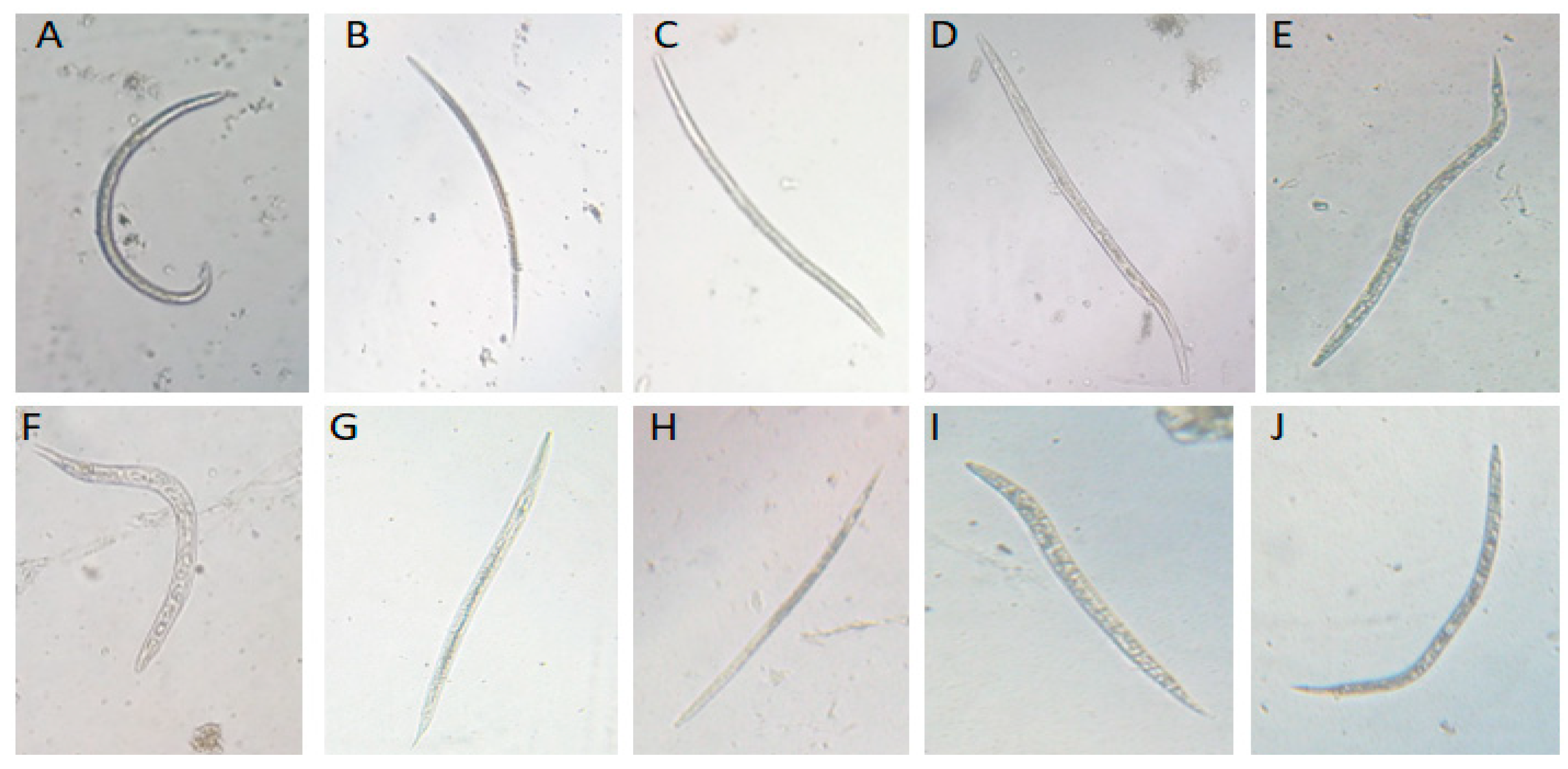 Figure 6. M. incognita mortality of J2s under a light microscope following 72 h immersion in the X. indica filtrate compared with two controls, (A) H2O and (B) Anti-Nema, (C) at 100%, (D) 75%, and (E) 50%; furthermore, its biogenic Ag-NPs were compared with two controls, (F) H2O and (G) Anti-Nema, (H) at 100%, (I) 75%, and (J) 50%.