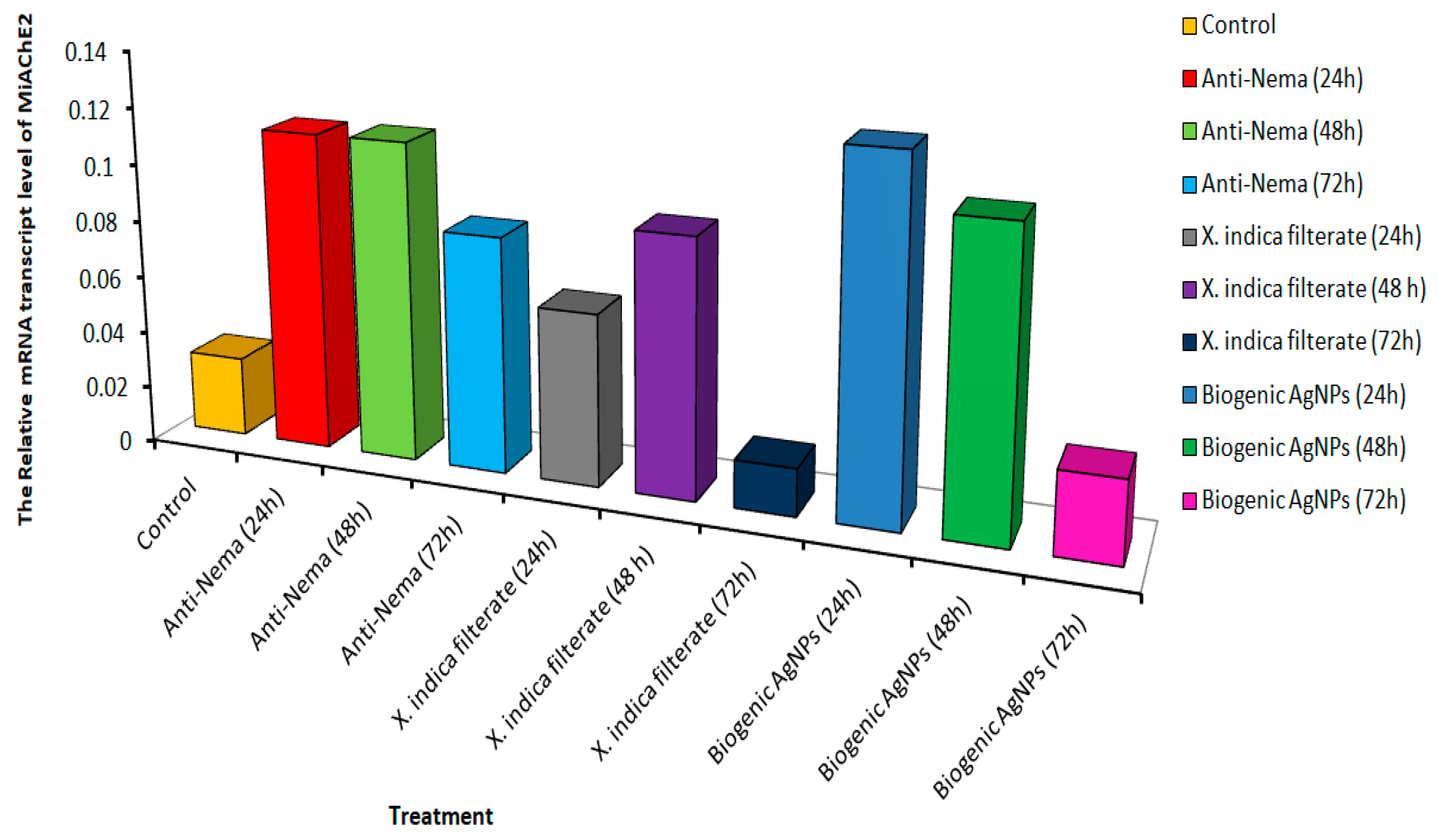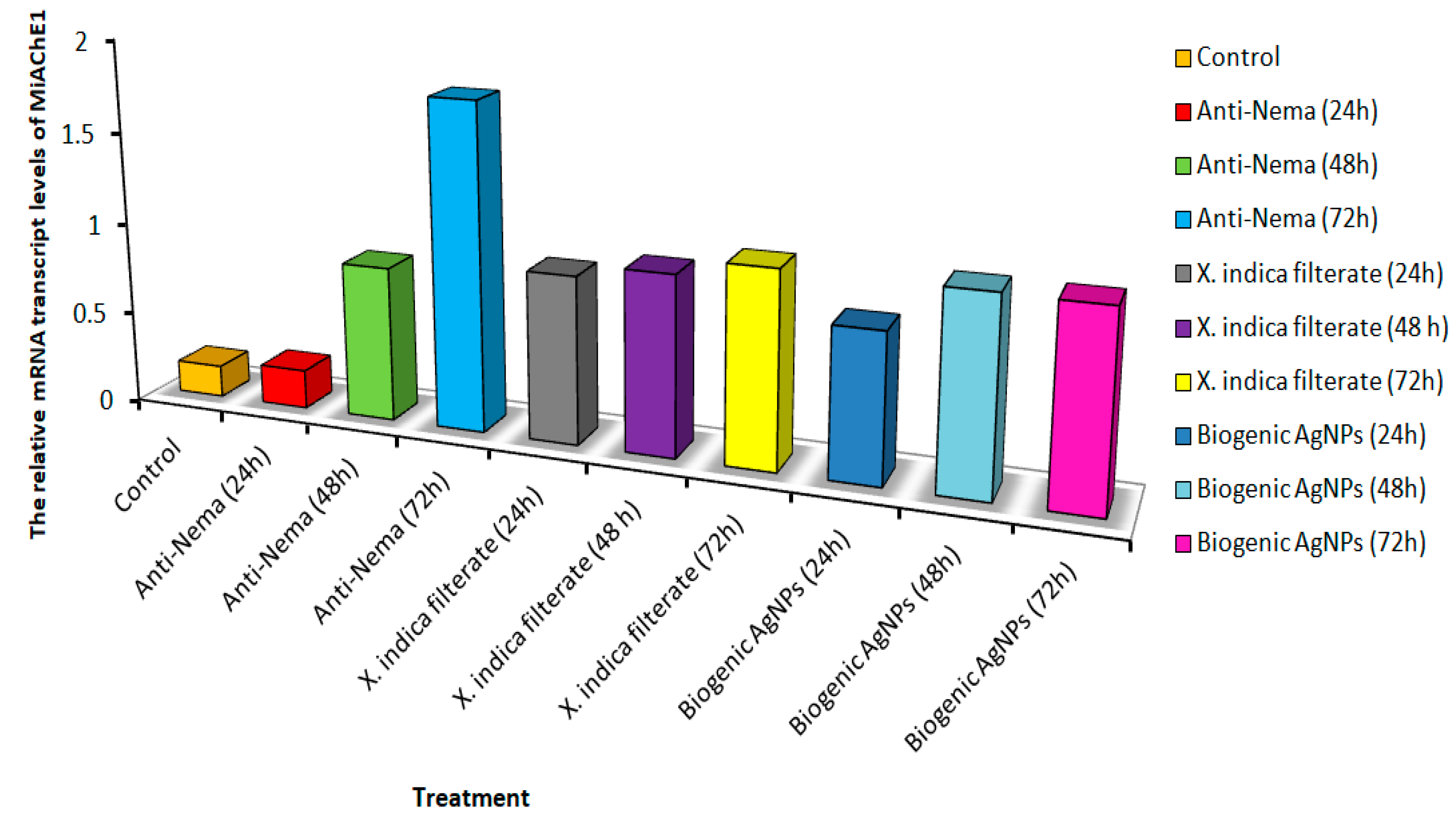 Figure 8. QRT-PCR confirmation of the relative gene expression of MiAchE1 in M. incognita J2 larvae after treatment with the X. indica filtrate, compared to healthy controls and those treated with a commercial anti-nematode bio-nematicide for 24, 48, and 72 h.