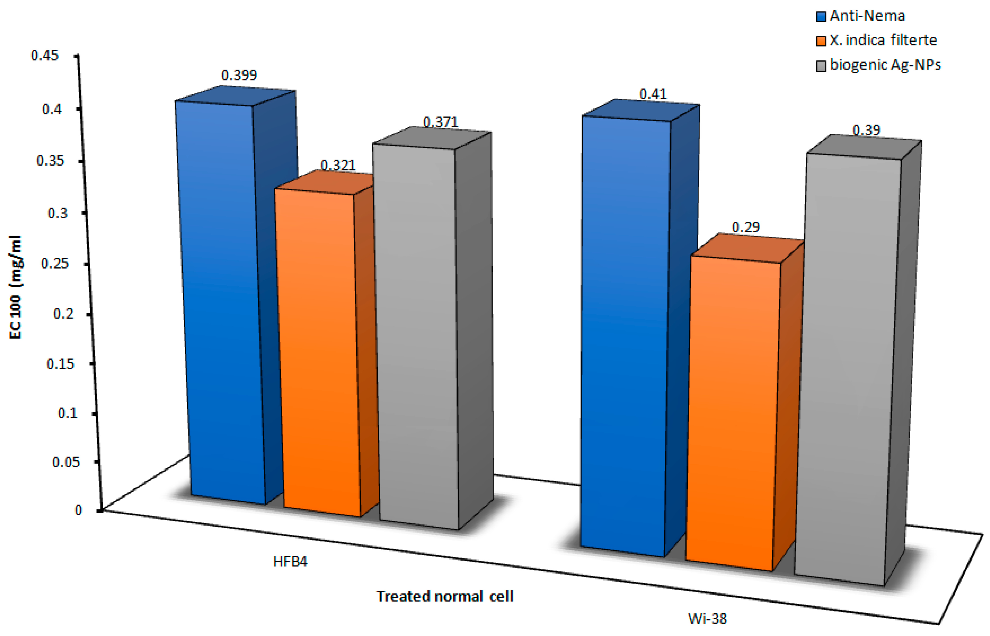Figure 11. The cytotoxicity of the X. indica filtrate and its Ag-NPs was observed at a safe dose (EC100) on both human normal cell lines (HFB4 and WI-38), in comparison to Anti-Nema.