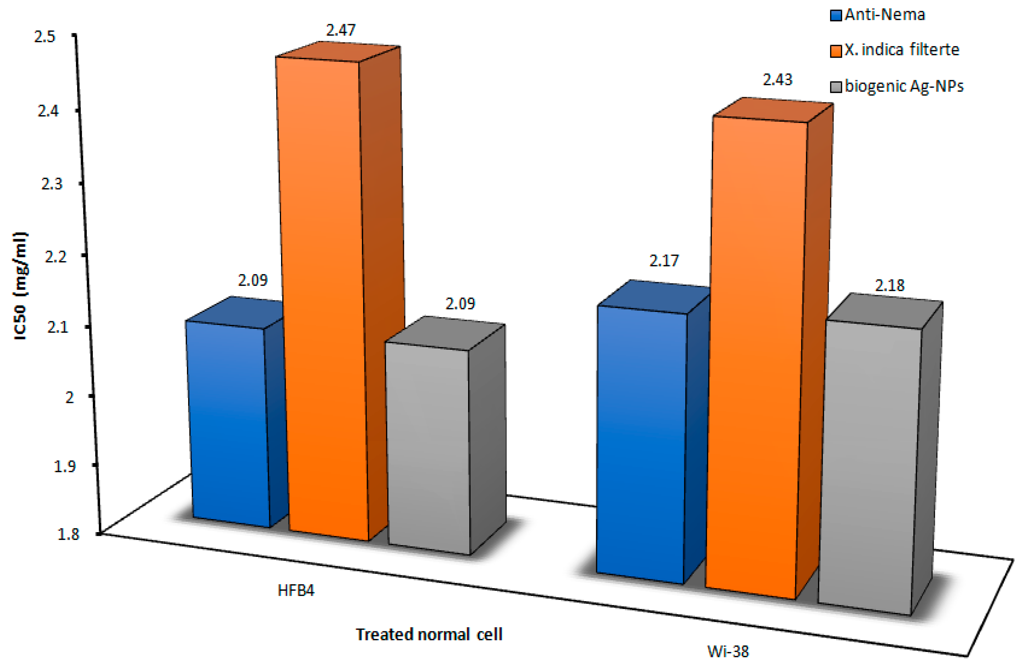 Figure 10. The cytotoxicity of the X. indica filtrate and its Ag-NPs was demonstrated at a dose causing 50% cell death (IC50) on both human normal cell lines (HFB4 and WI-38), compared to Anti-Nema.