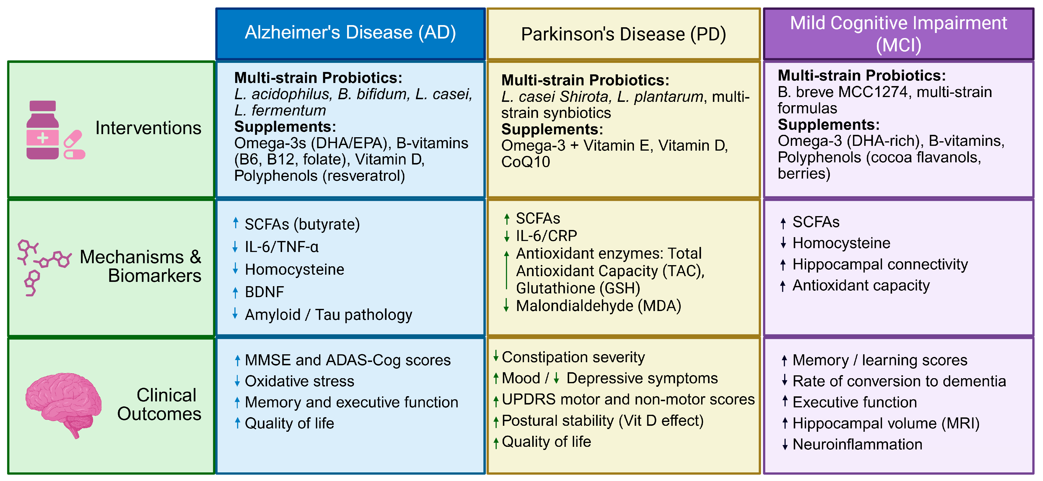 | Xiao et al. (2020) [76] | MCI | Randomized, double-blind, placebo-controlled | 80 | Bifidobacterium breve MCC1274 | 16 weeks | Cognitive battery, inflammatory markers | Improved memory and visuospatial function; reduced CRP and IL-1β |