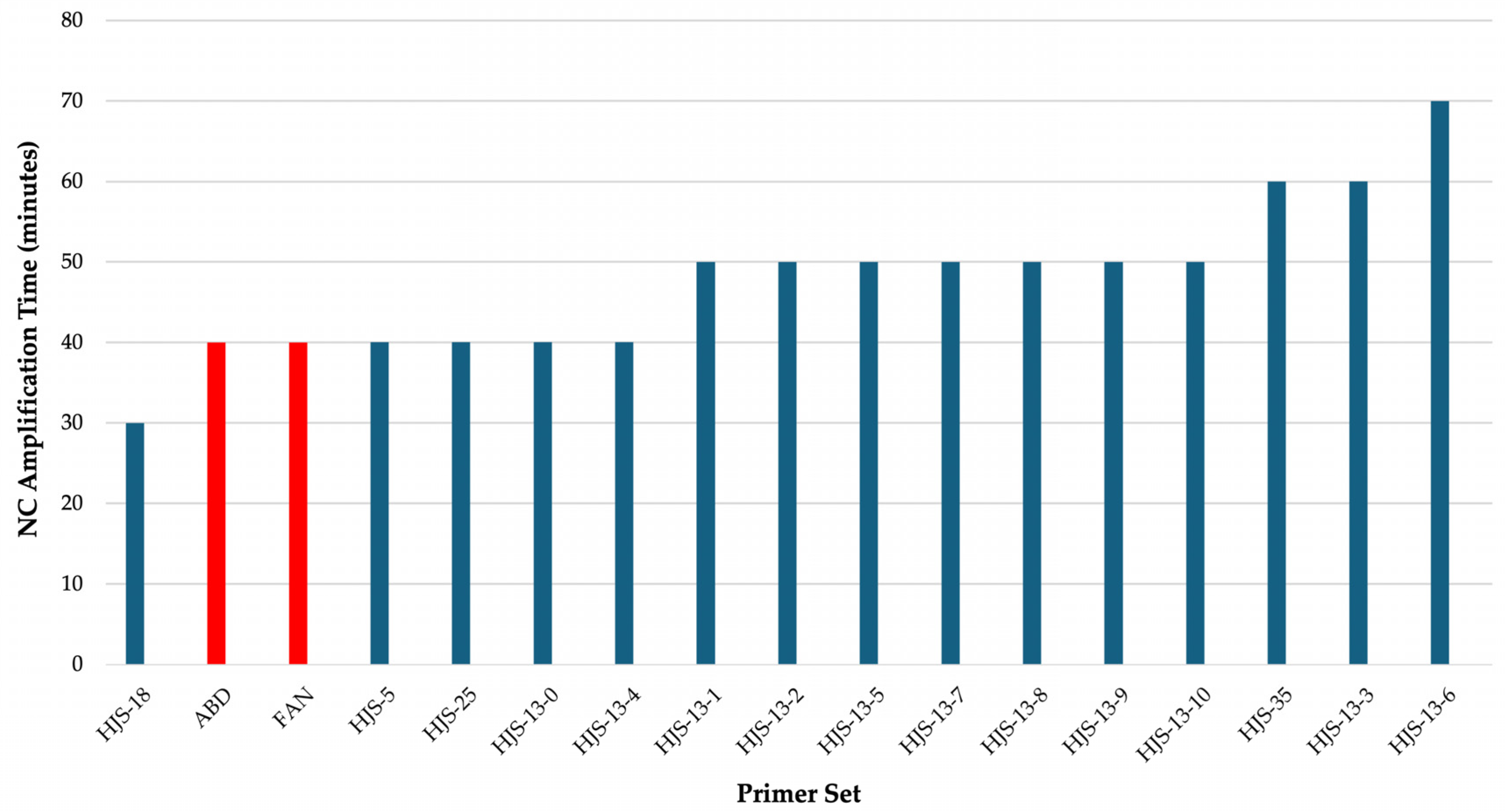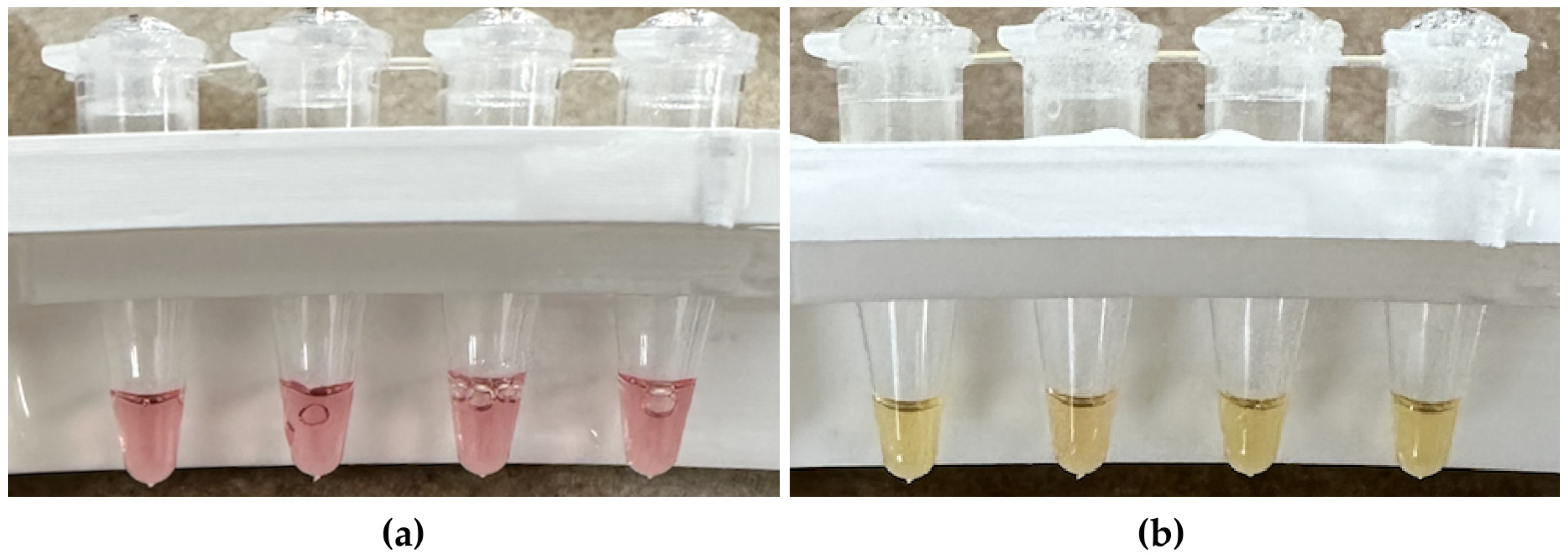 - Colosimo, F.; Tanner, N.A.; Patton, G.C.; New England Biolabs. LAMP Primer Design Using the NEB LAMP Primer Design Tool: Critical Considerations for Assay Robustness, Speed and Sensitivity; New England Biolabs: Ipswich, MA, USA, 2025. [Google Scholar]