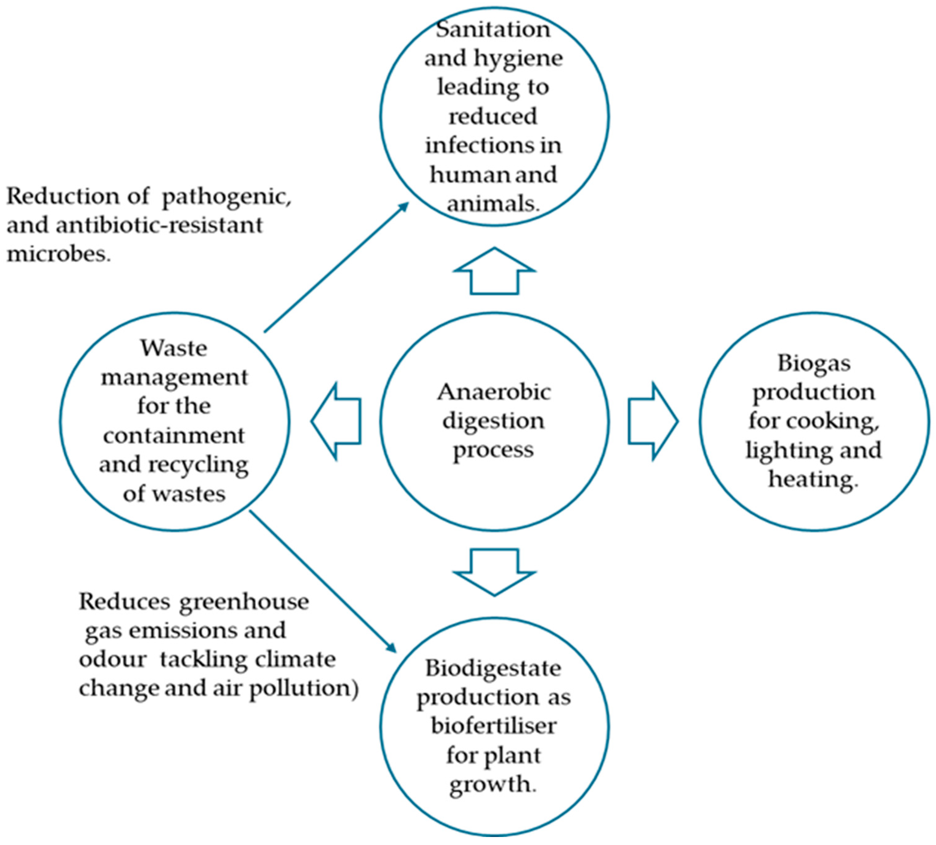 | Enterococcus faecalis | It is described as a Gram-positive, facultatively anaerobic, and opportunistic/nosocomial bacterium with the ability to resist or withstand harsh environmental conditions. Therefore, it demonstrates great adaptability. The bacterial species belonging to the genus Enterococcus, family Enterococcaceae, phylum Firmicutes, is also known as faecal streptococci. It is suggested as the most suitable bacterium to validate the hygienic treatment of biowaste in biogas plants. The bacterium produces proteins as virulence factors that enhance its pathogenicity. More attention is given to E. faecalis because of its extensive resistance to multiple antibiotics through plasmid and transposon transfer, chromosomal exchange, or mutations. Based on its ubiquitous nature, outstanding adaptative capability added to the propensity to acquire virulence and resistance genes, making them excellent sentinels for evaluating the spread or presence of the presence/spread of pathogenic and virulent clones and hazardous determinants across settings of the human–animal–environment triad. | It has graduated from being a commensal bacterium to becoming a leading pathogen in humans and animals. In humans, it causes urinary tract infections. In animals, it leads to endocarditis, diarrhoeae, septicaemia, and mastitis. | Transmission via handling and consuming contaminated foods or direct contact with animals or their environment. | Marques et al. [297]; Mubarak et al. [298]; Cebeci [299]. |