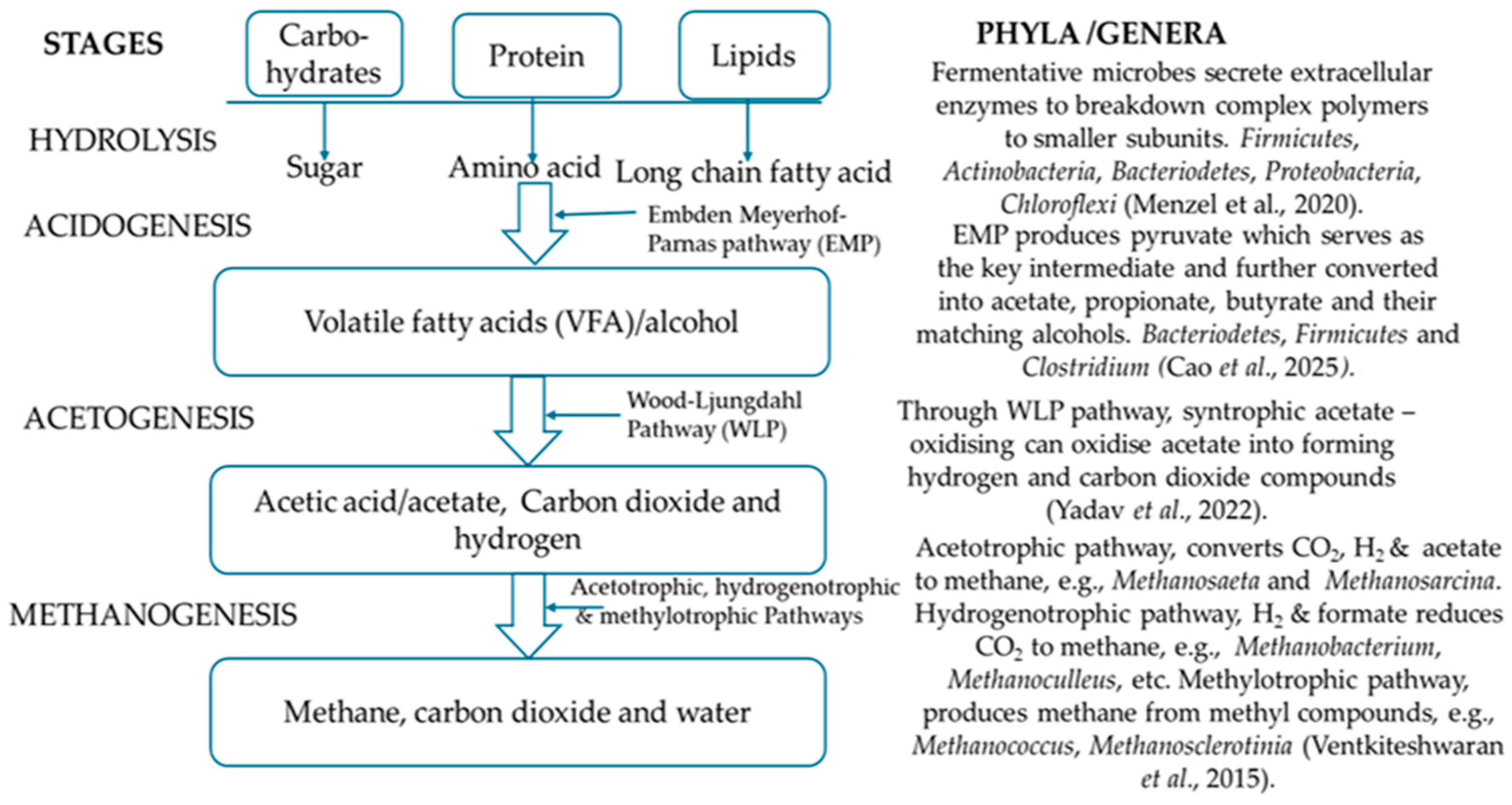 - Cao, J.; Zhang, C.; Li, X.; Wang, X.; Dai, X.; Xu, Y. Microbial Community and Metabolic Pathways in Anaerobic Digestion of Organic Solid Wastes: Progress, Challenges and Prospects. Fermentation 2025, 11, 457. [Google Scholar] [CrossRef]