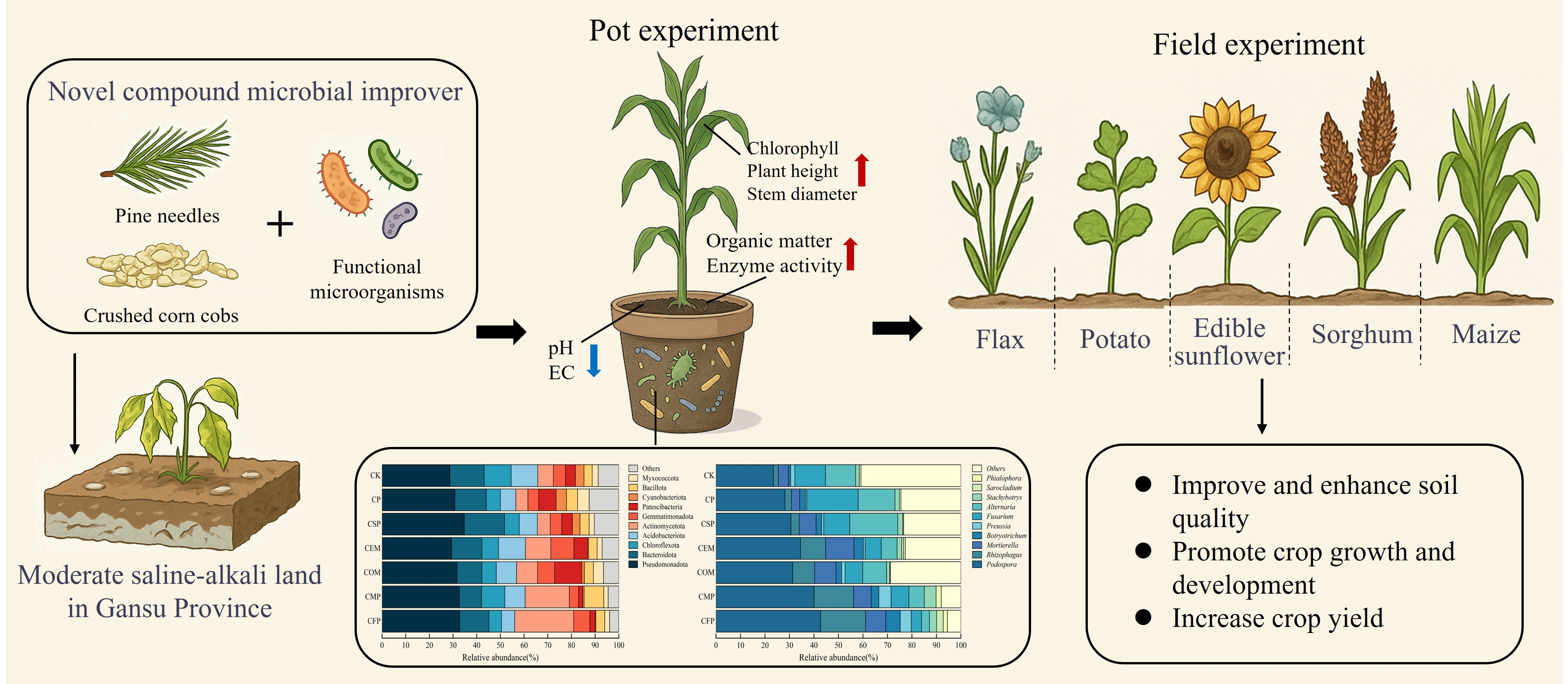 Rhizopus viridis (L1)] as candidate strains. Their symbiotic properties, growth-promoting capabilities, and salt-alkali tolerance were evaluated to identify superior strains. Simultaneously, to alleviate mild soil compaction in Lanzhou New Area’s cultivated soils and ensure microbial agent stability, two waste biomass sources: pine needles (particle size: 0.80–1.00 mm) and crushed corn cobs (particle size: 0.38–0.40 mm)—were selected as organic substrates for the amendment. This aims to enrich nutrient sources for soil microorganisms and enhance soil aeration. Recognizing that the microbial-to-organic-substrate ratio is critical for soil improvement efficacy, 19 soil saturation experiments were designed for screening and optimization. To validate the selected formulation’s ameliorative effect on saline-alkali soils, pot experiments were conducted using maize as an indicator plant. Finally, field verification trials were conducted using five locally cultivated cash crops: flax, potato, edible sunflower, sorghum, and maize. Experimental groups included an amended treatment group (EG) and an untreated control group (CG). The experimental design is illustrated in