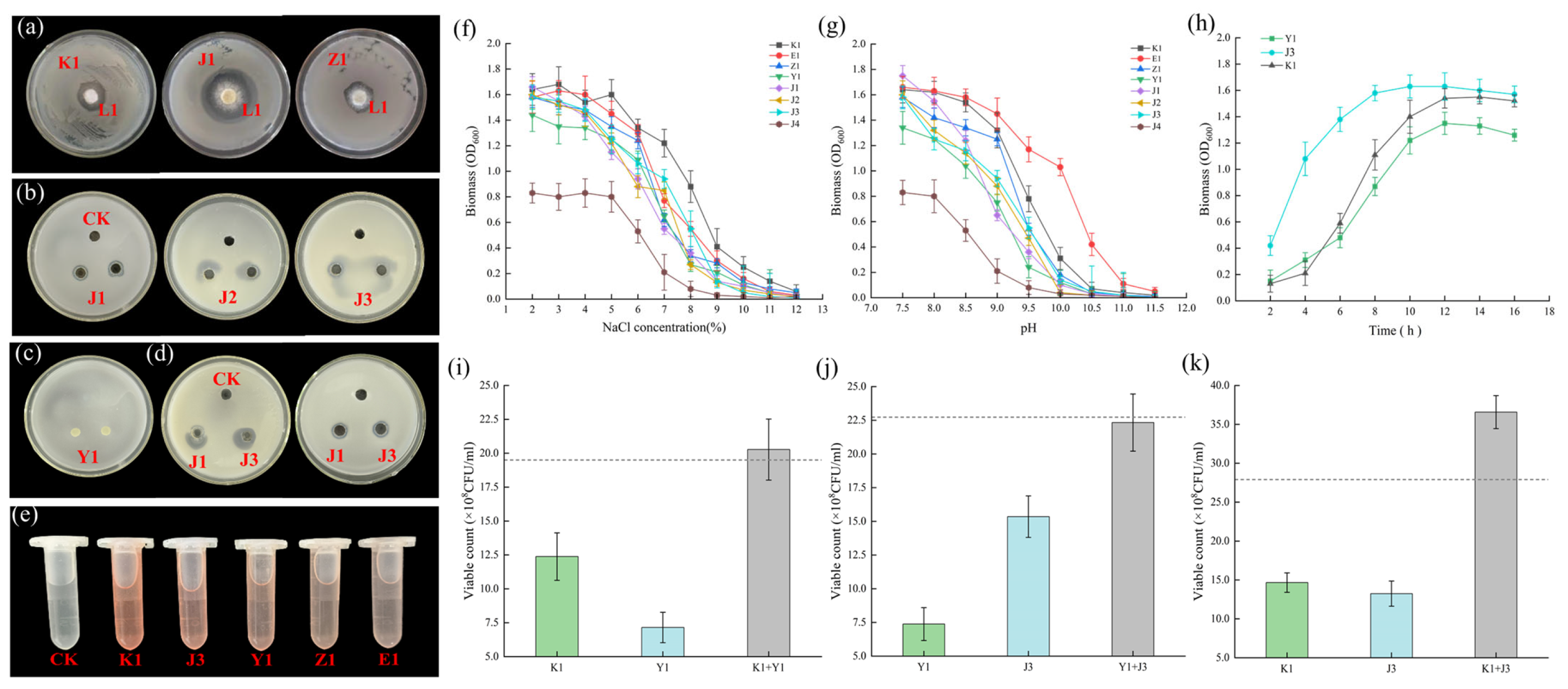 In the present study, antagonistic interactions between strain L1 and strains K1, J1, and Z1 were identified, leading to their exclusion from the final formulation. In contrast, co-culture experiments demonstrated a clear symbiotic relationship among strains K1, Y1, and J3. The total biomass produced under co-culture conditions exceeded the sum of their individual biomasses, providing experimental evidence for positive interspecific interactions and functional complementarity [