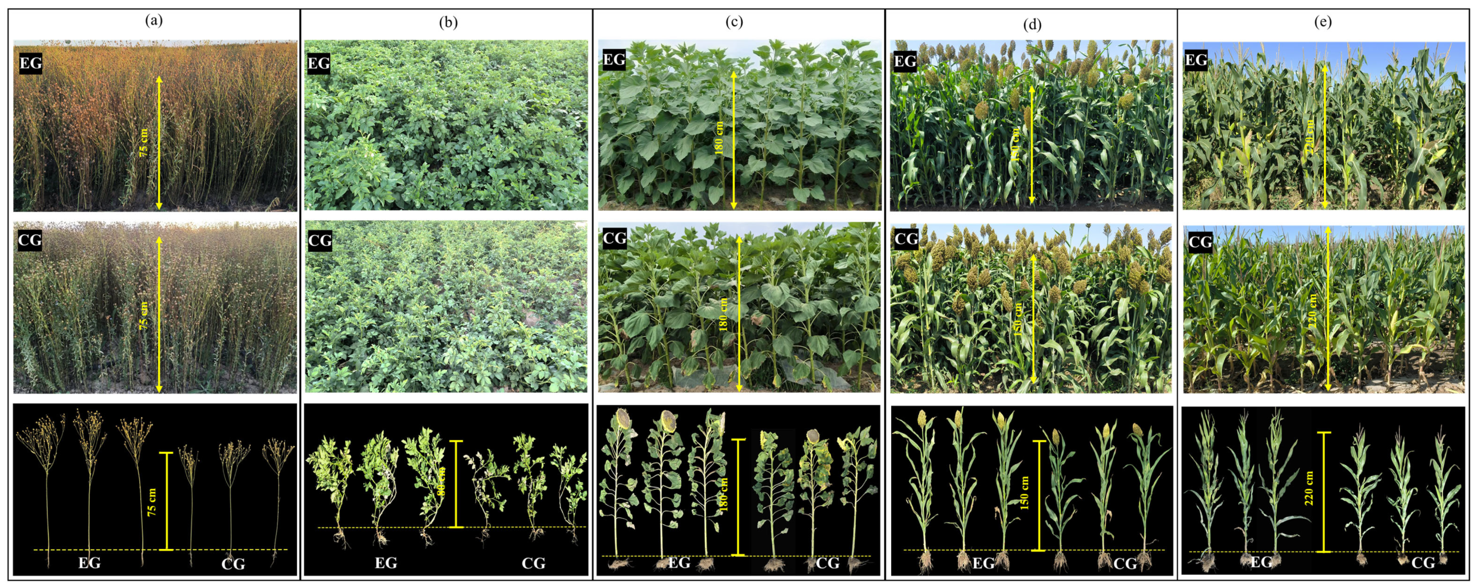p < 0.01). Flax exhibited the greatest increases in plant height and root length (13.96%, 21.56%), reaching 85.48 ± 5.26 cm and Cohen’s d value 2.12, and 13.59 ± 1.28 cm, Cohen’s d value 1.73, respectively. Potato exhibited the highest increase in stem thickness (37.12%), reaching 15.28 ± 1.51 mm, with a Cohen’s d value of 3.02. Above-ground and below-ground fresh weights of crops in all experimental fields significantly increased (