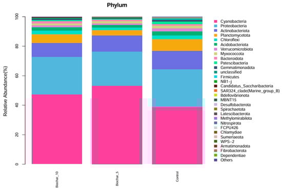 The relative abundance of microbial phyla across three treatments was studied (Figure 2). The bar plots represent the composition of microbial communities at the phylum level; different colors represent different phyla. Cyanobacteriota and Proteobacteria were the two most abundant phyla across all treatments, representing a major fraction of the microbial community within each group. Actinobacteriota, Planctomycetota, and Chloroflexota were also present, though their relative abundance was much lower than Cyanobacteriota and Proteobacteria. At the phylum level, the general composition of phyla appeared similar across the three treatments, indicating that, at this taxonomic level, the application of SSB at either 5% or 10% had minimal effect on microbial community structure. A variety of low-abundance phyla, such as Patescibacteriota, Gemmatimonadota, Firmicutes, and Spirochaetota, that contribute to diversity were also present, but in smaller proportions that did not alter the community structure in any treatment. The phylum composition of microbial community across treatments and the stability of major phyla relative abundance indicates a stable structure at the phylum level in response to 5% and 10% SSB application.
