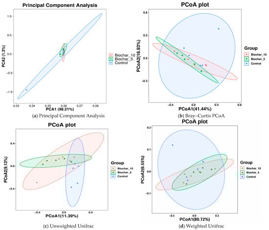 To test which factors in our experimental design contribute to differences in the beta diversity of microbial communities associated with the rhizosphere, PERMANOVA analyses were performed independently on each sample type using Bray–Curtis distances. To further visualize whether biochar amendment influenced microbial community composition, we conducted principal coordinate analysis (PCoA) using both Bray–Curtis and UniFrac distances. The PCoA plot was based on distance matrices, with PCoA1 and PCoA2 explaining 41.44% and 16.93% of the variance, respectively. Each treatment group has its confidence ellipse. The findings showed that the control group is more dispersed, suggesting a higher variability within as compared to the biochar-treated groups (Figure 5b). The ellipses of the biochar treatments (5% and 10% biochar) overlap with the control but are slightly closer to each other, indicating that biochar treatments could have a mild clustering effect. However, the overlap between all groups indicates no significant differences in microbial composition. There are signs of clustering in the biochar-treated samples, but the fact that the biochar treatments and the control samples are similar shows that biochar did not change the composition of the microbial communities. The moderate separation along PCoA1 (41.44% of variance) could be due to biochar’s small effects on community structure. Although the ordination plots may show only moderate separation, these subtle shifts can be ecologically and agriculturally meaningful.