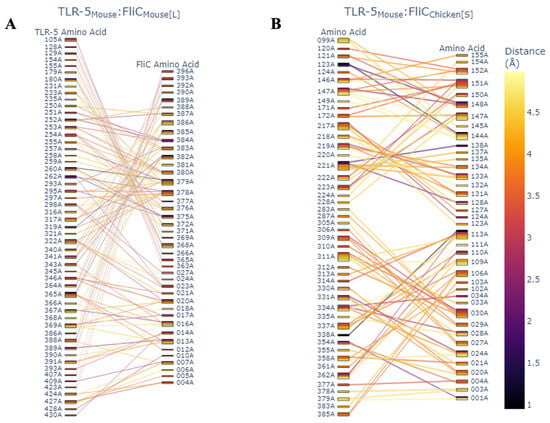Figure 9. Parallel category plots of HDock interface residues. Interfaces between mouse TLR-5 binding and mouse SFB large FliC (A), and LSL-SFB FliC-2 (B). Color represents the computed interface distance between amino acids.