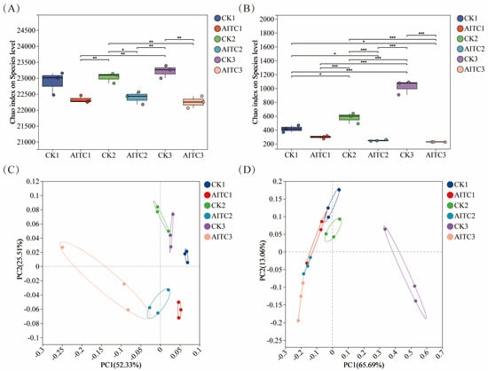 Differences in bacterial and fungal α-diversity indices and principal coordinate analysis (PCoA) based on the Bray–Curtis matrix. (A,B) Chao1 index of bacterial (A) and fungal (B) communities under different treatments. CKi: Control groups with i-times of mock fumigation (i = 1, 2, 3). AITCi: Treatment groups with i-times of AITC fumigation (i = 1, 2, 3). Bars with different letters indicate significant differences (p < 0.05). (C,D) Principal coordinate analysis (PCoA) of bacterial (C) and fungal (D) communities based on Bray–Curtis distance. Symbols correspond to the treatments described above. * 0.01 < p ≤ 0.05, ** 0.001 < p ≤ 0.01, *** p ≤ 0.001.