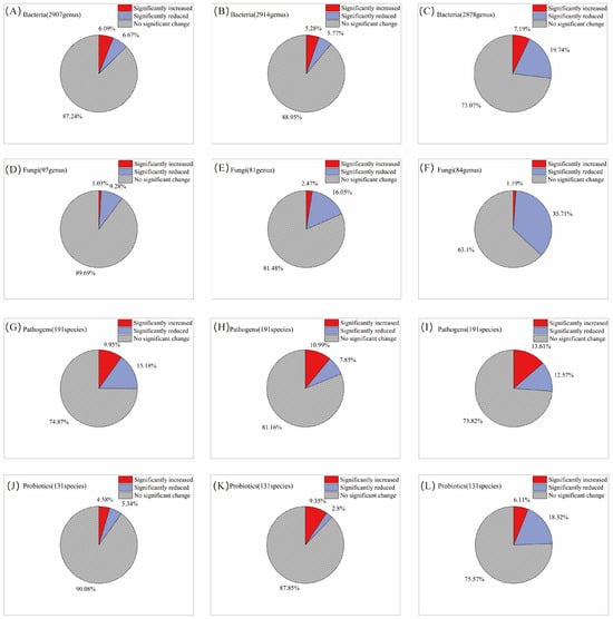 Changes in the proportion of microorganisms by category with increasing frequency of AITC fumigation. (A,D,G,J) Fumigated once; (B,E,H,K) fumigated twice; and (C,F,I,L) fumigated three times. The proportions represent the mean percentage of genera showing a significant increase or decrease relative to their respective mock-fumigated control groups (CKi).