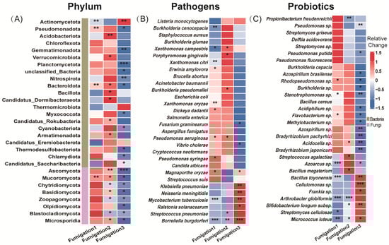 Heatmap showing microbial changes with fumigation frequency. (A) Phylum-level bacterial communities (top 22) and fungal communities (top 8); (B) top 30 plant pathogens by abundance (at the species level); and (C) top 30 abundant plant-beneficial microorganisms (at the species level). Relative change was calculated as (AITCi − CKi)/CKi, where CKi represents the mock-fumigated control group subjected to the same physical sealing procedure i times (i = 1, 2, 3). Asterisks denote significance levels (* p < 0.05, ** p < 0.01, and *** p < 0.001).