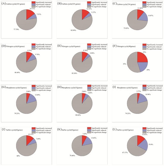 Nitrogen cycle genes exhibited high sensitivity to AITC fumigation (Figure 4D–F). The proportion of genes showing significant responses increased substantially from 19.5% after one fumigation to 27% after three fumigations. Concurrently, the proportion of genes showing no significant change decreased from 80.5% to 55%. After three fumigations, the proportion of significantly upregulated genes (25%) exceeded that of downregulated genes (20%). Sensitive nitrogen cycle genes were primarily associated with nitrification (amoC, hao), denitrification (nosZ, norB/C), and nitrogen assimilation (glnA, gdhA, nasA/C) modules. Tolerant genes were mainly enriched in nitrogen fixation (nifD/H/K), dissimilatory nitrate reduction (nrfA, napA/B), as well as in transport and cyanide degradation (nrtC/D, nasD, cynD, ureB) modules (Figure 5B; Table S1).