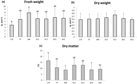 Roots fresh weight (a), dry weight (b), and dry matter (c) in plants in the second pot experiment without abiotic stresses. Mean values (±SD); (a, b, c) different letters in each graphs represent statistically significant differences based on Tukey’s post hoc test (p ≤ 0.05), no letters indicate no significant effect. CTR: control thesis, PT: P. taiwanensis T_2_C, BM: B. mojavensis CSS_C9, BT2: B. tropicus PB_7, BT3: B. tequilensis CSS_7_3, BV1: B. velezensis PB_8, and BV2: B. velezensis CSS_12_1.