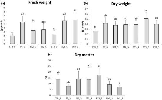 Roots fresh weight (a), dry weight (b), and dry matter (c) in plants in the second pot experiment with salt stress. Mean values (±SD); (a, b, c) different letters in each graphs represent statistically significant differences based on Tukey’s post hoc test (p ≤ 0.05). CTR_S: control thesis, PT_S: P. taiwanensis T_2_C, BM_S: B. mojavensis CSS_C9, BT2_S: B. tropicus PB_7, BT3_S: B. tequilensis CSS_7_3, BV1_S: B. velezensis PB_8, and BV2_S: B. velezensis CSS_12_1.