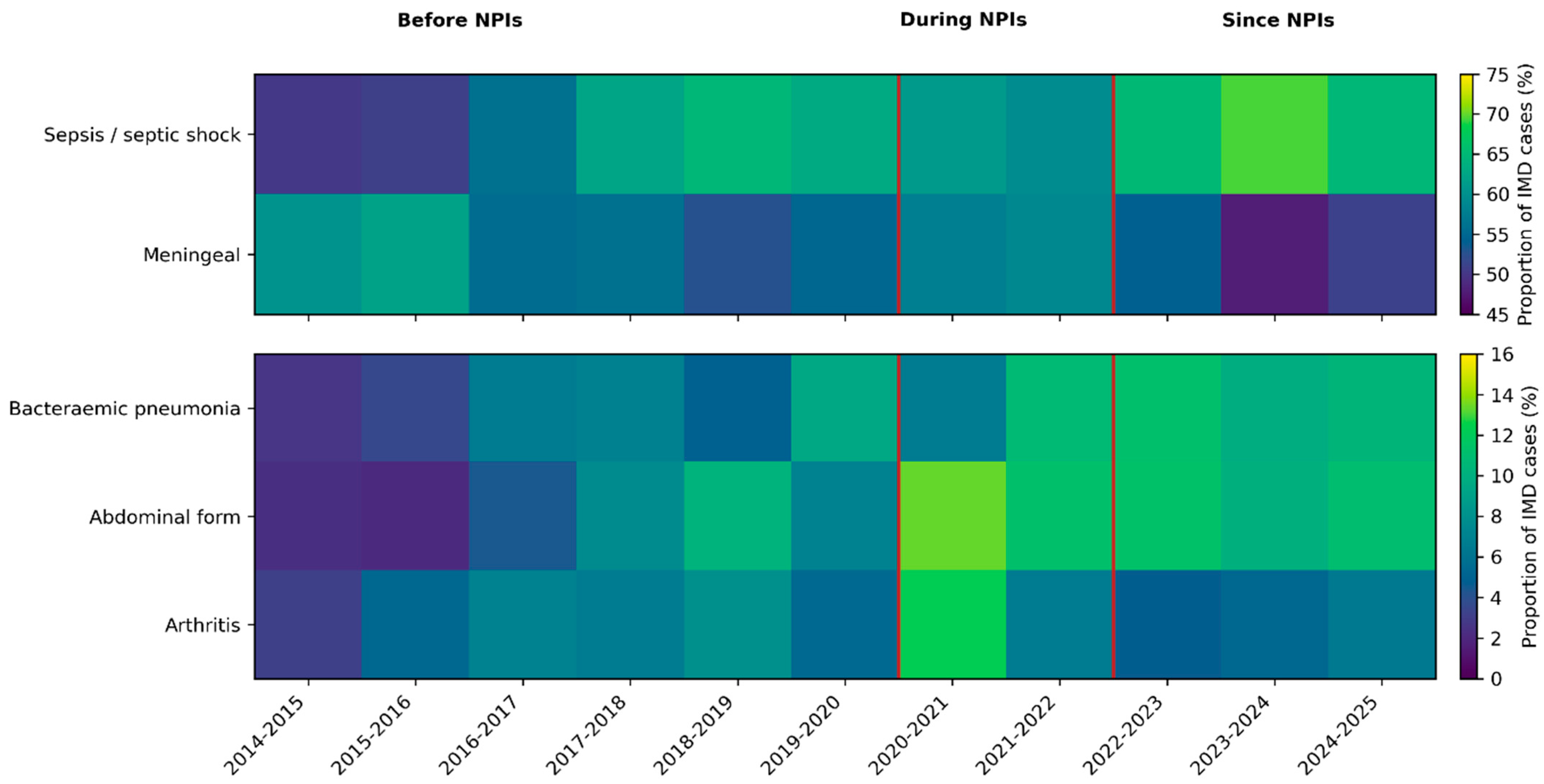 Among atypical forms, bacteraemic pneumonia occurred in 334 cases (7.7%), abdominal presentations in 345 (8.0%) and arthritis in 258 (6.0%). Epiglottitis and cardiac forms were rare, with 20 (0.5%) and 38 (0.9%) cases, respectively. Temporal changes in the distribution of major clinical presentations across epidemiological years, including the periods before, during and after non-pharmaceutical interventions related to the COVID-19 pandemic, suggest an increasing trend of atypical presentations, including meningococcal pneumonia and abdominal forms, after non-pharmaceutical interventions (