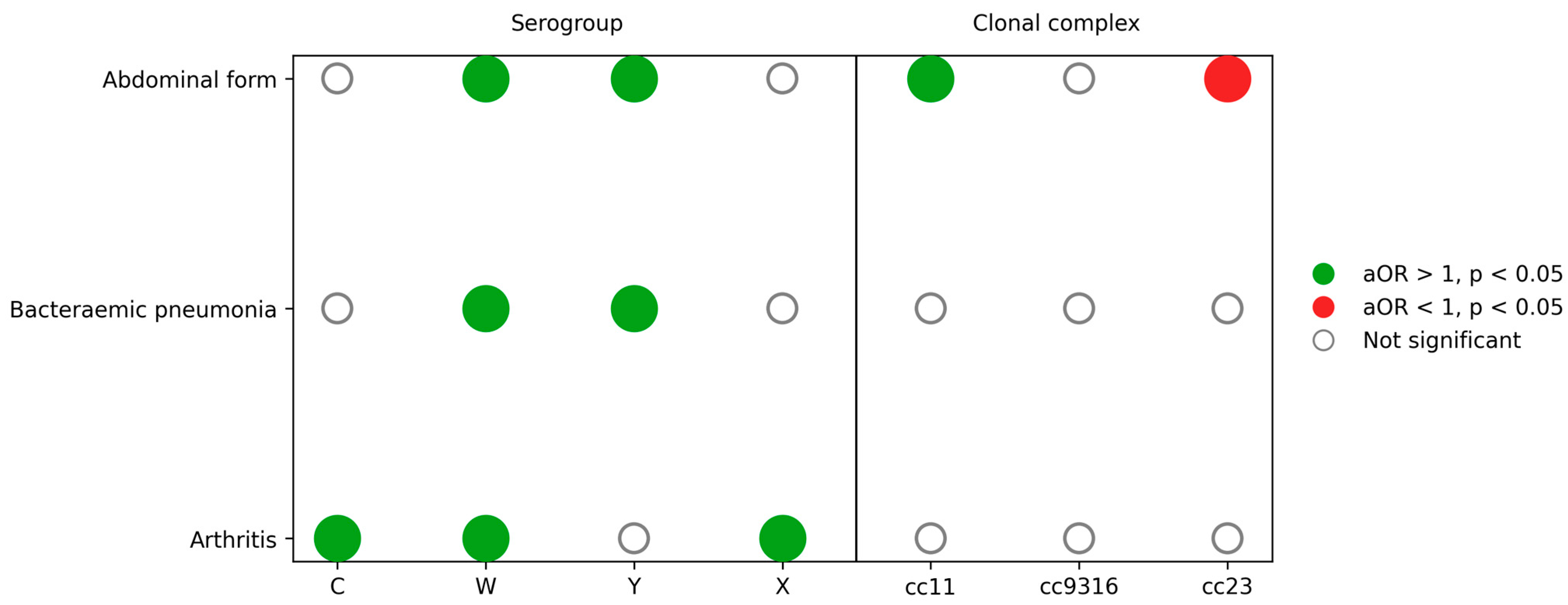 Multivariable logistic regression models were fitted separately for abdominal forms, bacteraemic pneumonia, sepsis or shock, meningeal presentations and arthritis, adjusting for age group, sex, serogroup and clonal complex. In adjusted analyses, age and serogroup were the dominant determinants of clinical forms, with a striking age gradient for bacteraemic pneumonia (65 years or older: adjusted odds ratio 24.1) and markedly lower odds of meningitis for serogroups W and Y compared with B. Adjusted determinants of atypical clinical presentations (abdominal form, bacteraemic pneumonia and arthritis) are detailed in