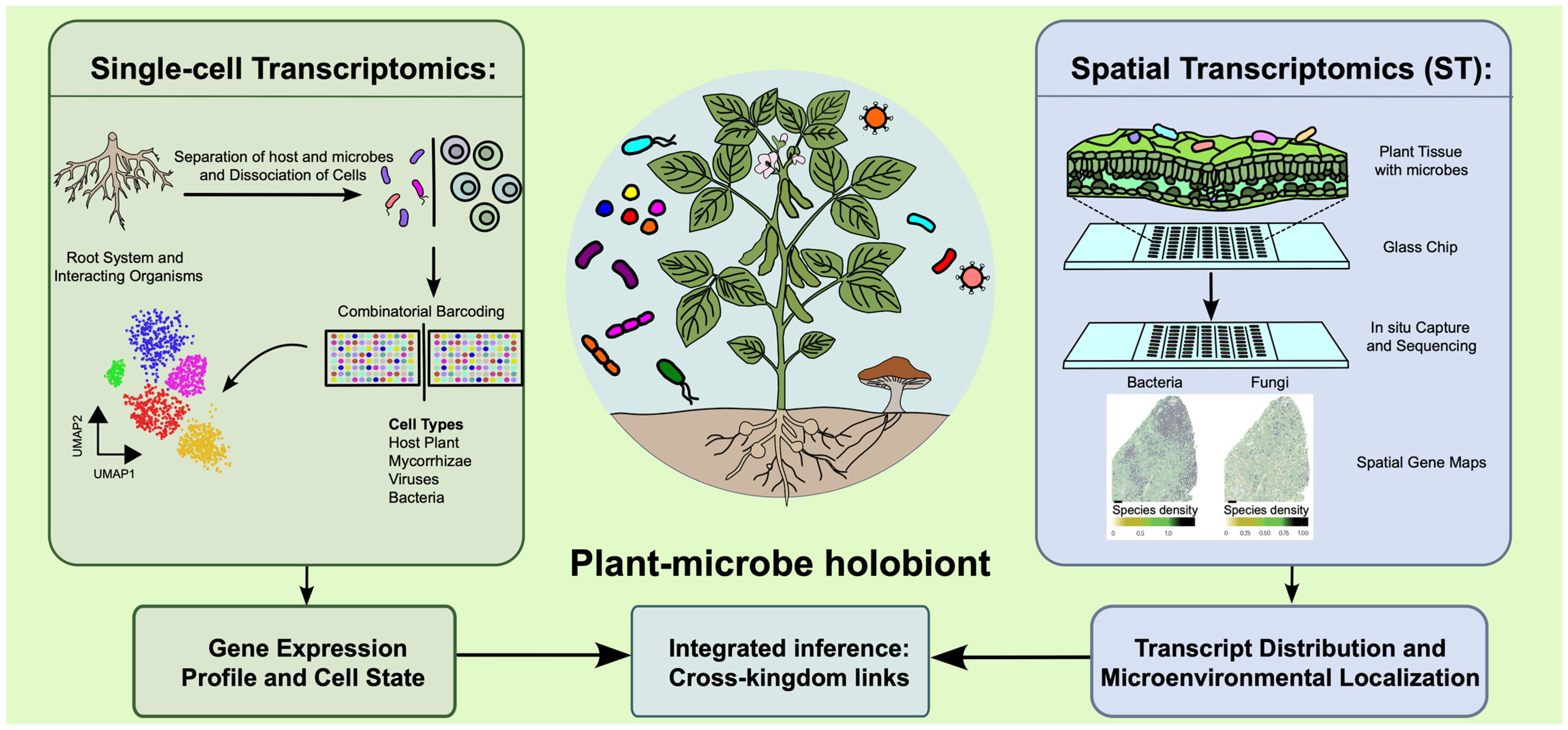 - Serrano, K.; Tedeschi, F.; Andersen, S.U.; Scheller, H.V. Unraveling plant-microbe symbioses using single-cell and spatial transcriptomics. Trends Plant Sci. 2024, 29, 1356–1367. [Google Scholar] [CrossRef] [PubMed]