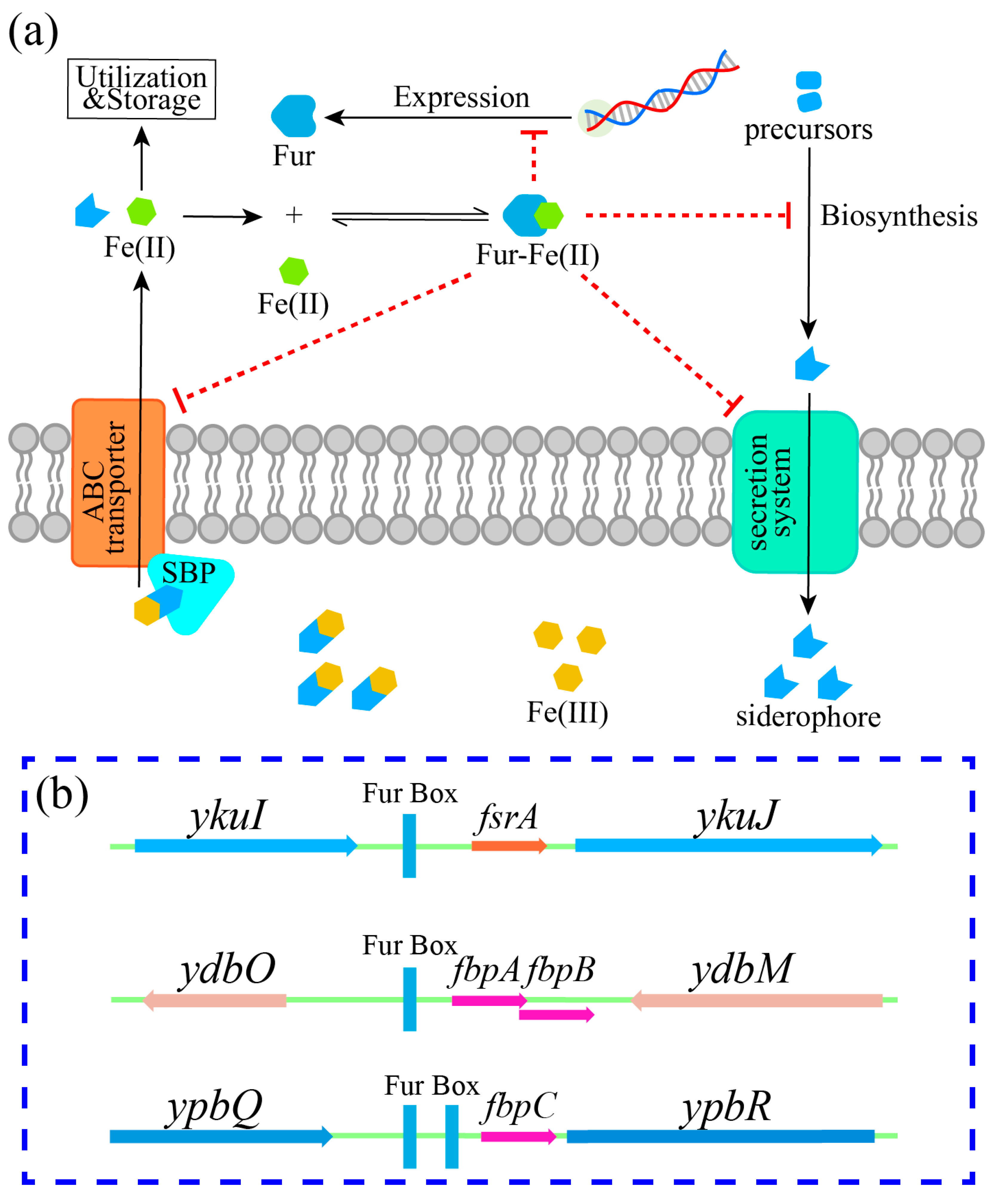 - Pi, H.; Helmann, J.D. Genome-Wide Characterization of the Fur Regulatory Network Reveals a Link between Catechol Degradation and Bacillibactin Metabolism in Bacillus subtilis. mBio 2018, 9, e01451-18. [Google Scholar] [CrossRef]