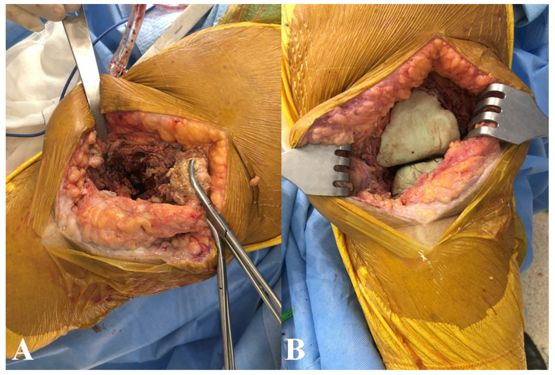 - Marmor, S.; Kerroumi, Y.; Meyssonnier, V.; Lhotellier, L.; Mouton, A.; Graff, W.; Zeller, V. One-stage exchange arthroplasty for fistulizing periprosthetic joint infection of the hip: An effective strategy. Front. Med. 2020, 7, 540929. [Google Scholar] [CrossRef]