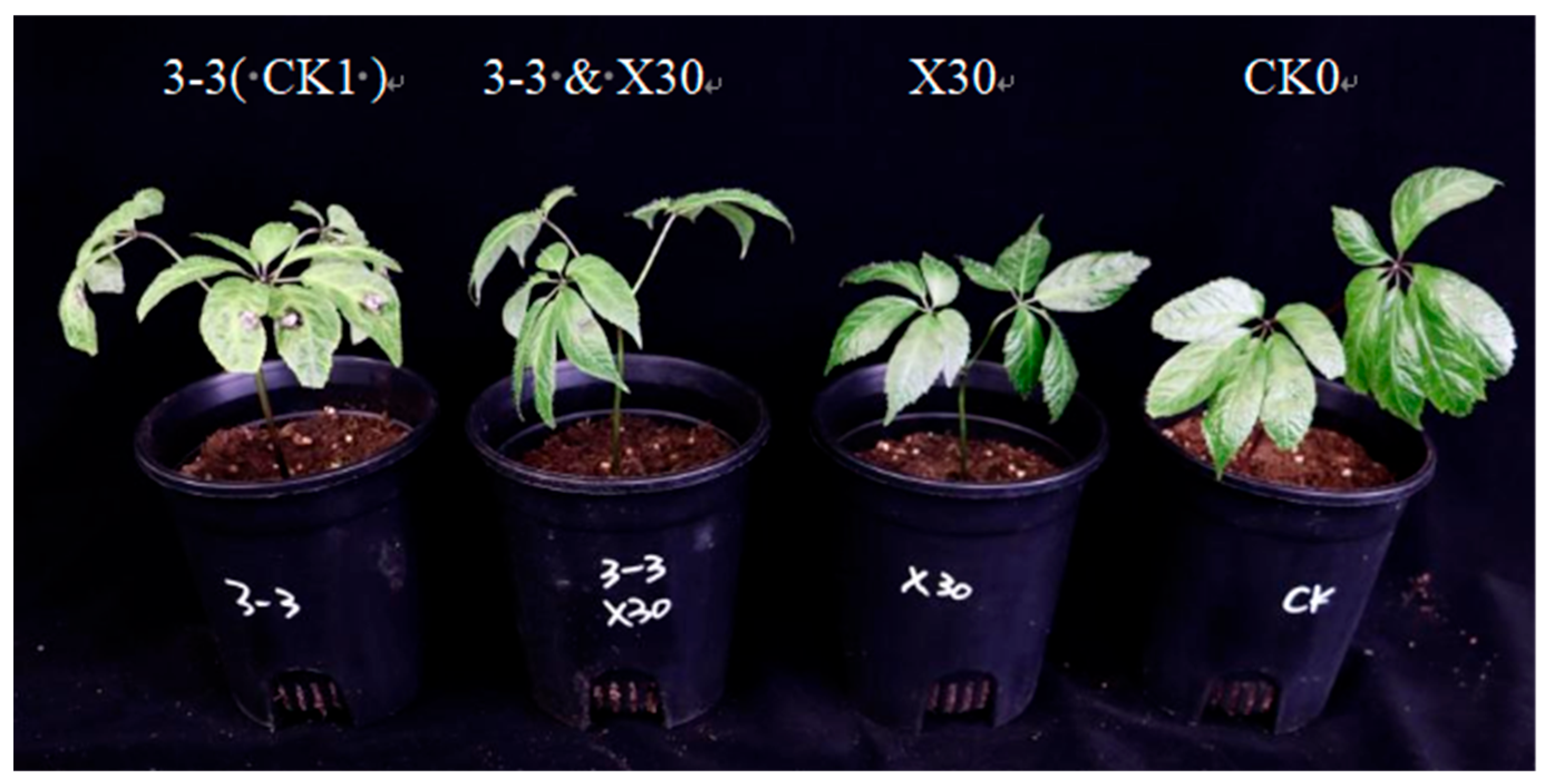 3.6. The Protective Effect of X30 Strain on the Leaves of P. notoginseng Infected by B. fabiopsis in Pot Experiment