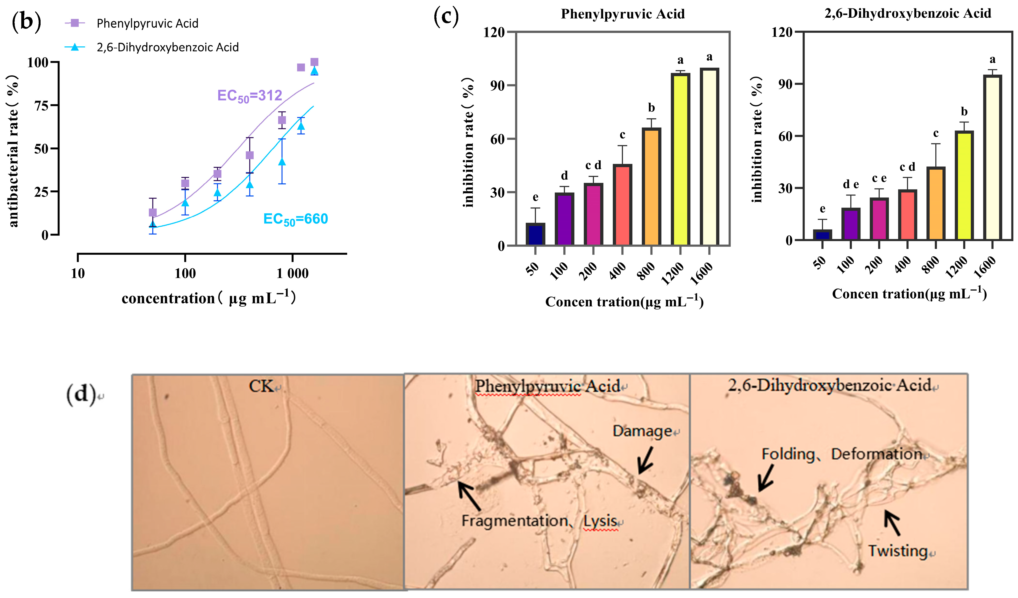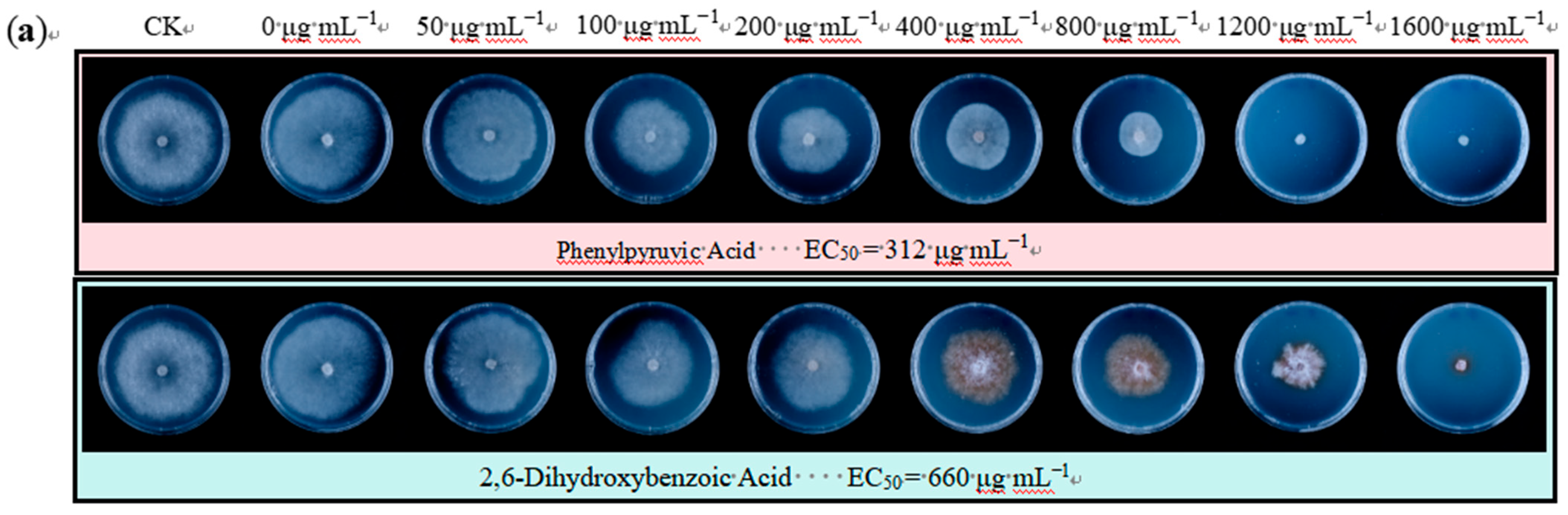 2.9. EC50 Values of Antifungal Compounds and Their Effects on Mycelial Morphology