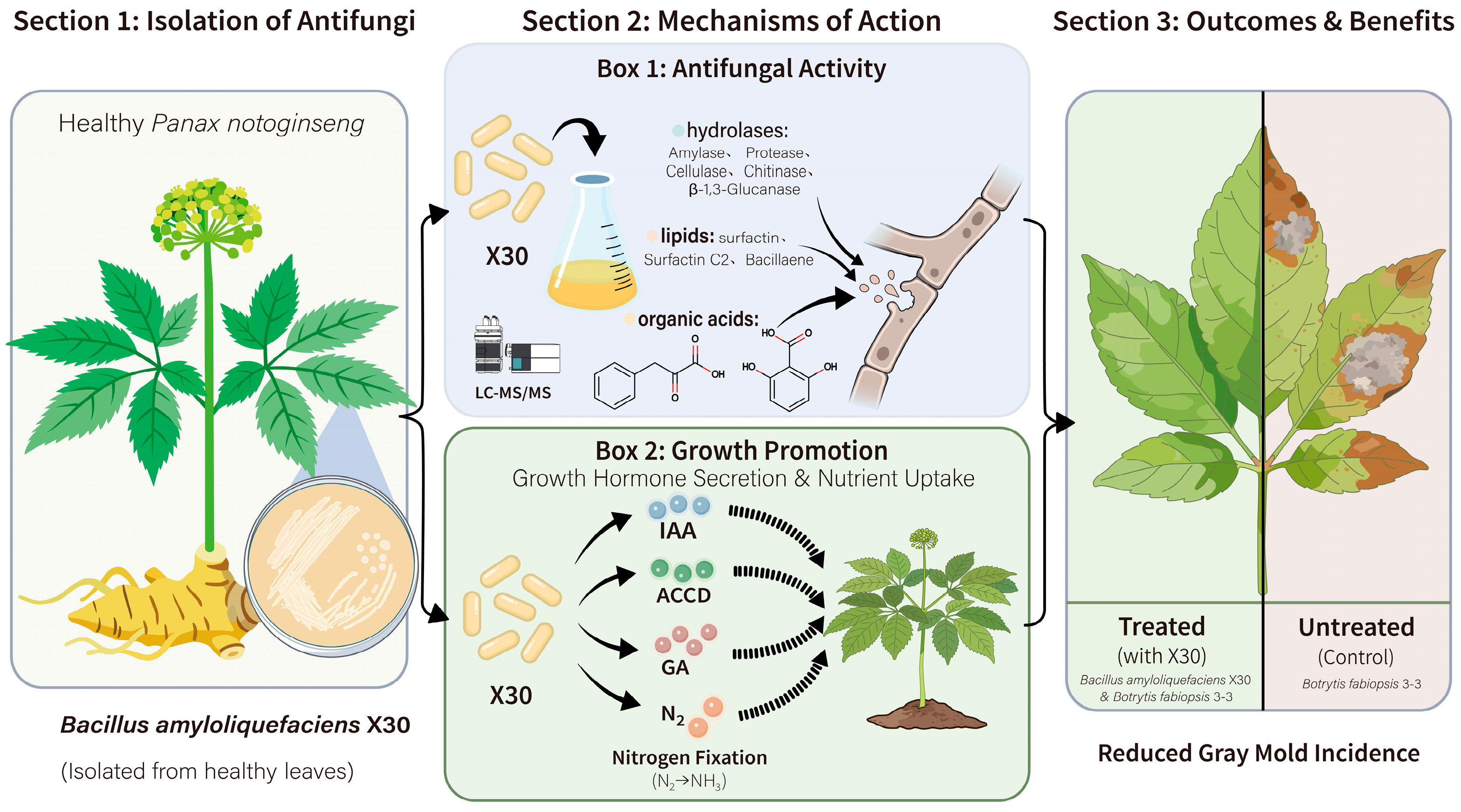 Chicago/Turabian StyleSun, Chang, Wei-Wei Gao, Yang Li, Yu Feng, Fu-Xin Li, Xue-Ping Wei, Jing-Xue Ye, and Yun-Jiang Liang. 2026. "Antifungal Activity of Bacillus amyloliquefaciens X30 Against Botrytis fabiopsis 3-3 on Panax notoginseng and Its Mechanism" Microorganisms 14, no. 2: 431. https://doi.org/10.3390/microorganisms14020431