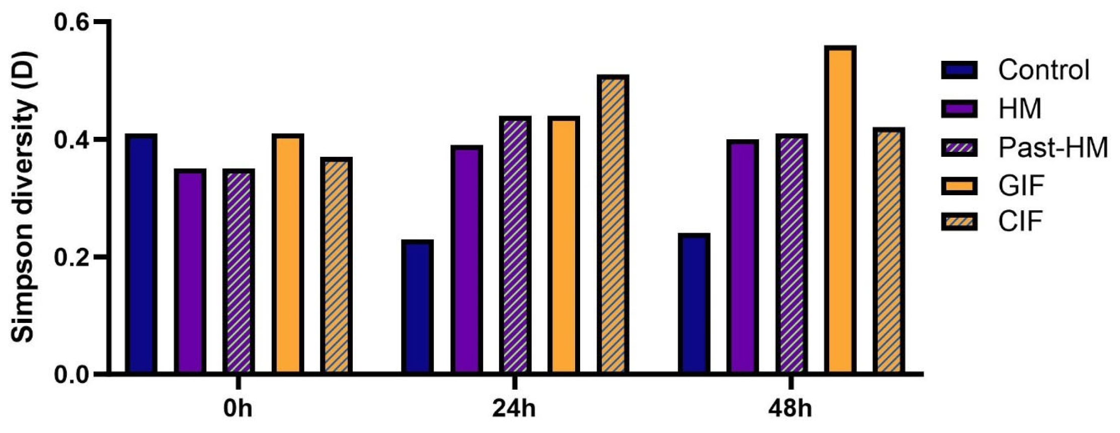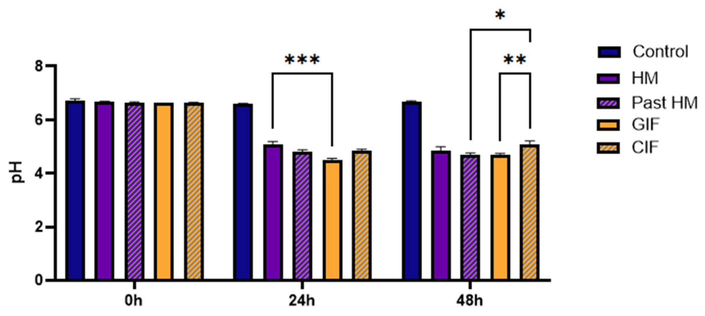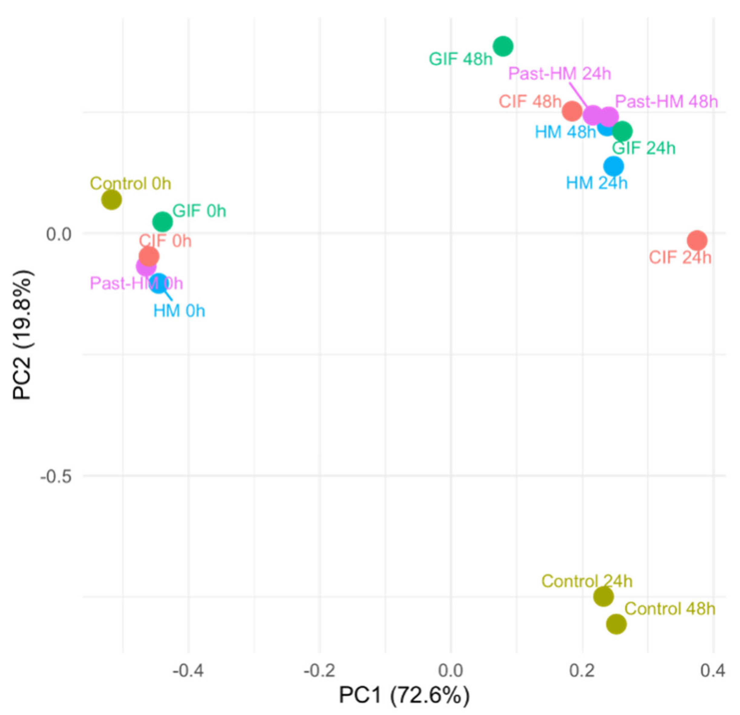 | Time (h) | Control | Raw HM | Pasteurized HM | GIF | CIF | ||||||||||