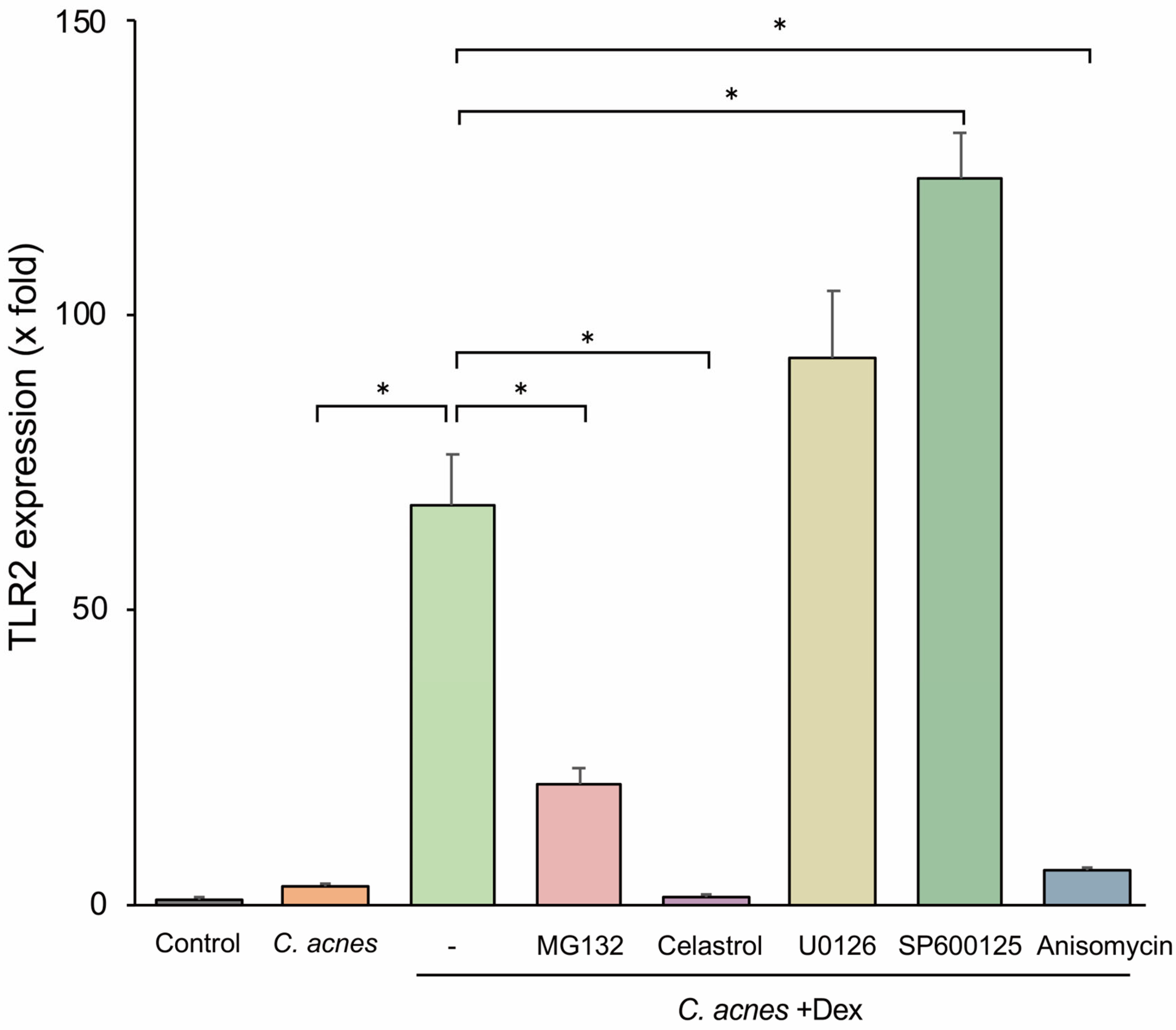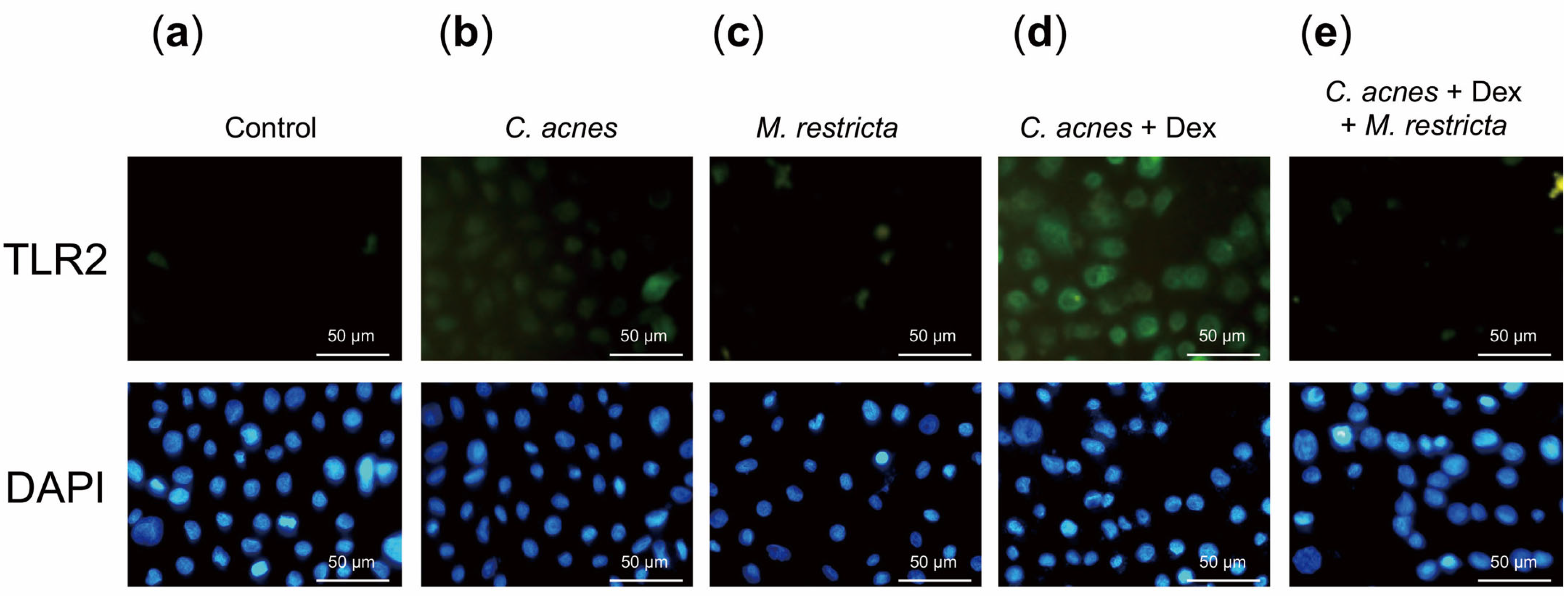 3.1. M. restricta Suppressed C. acnes-Induced TLR2 Expression upon Dex Treatment
