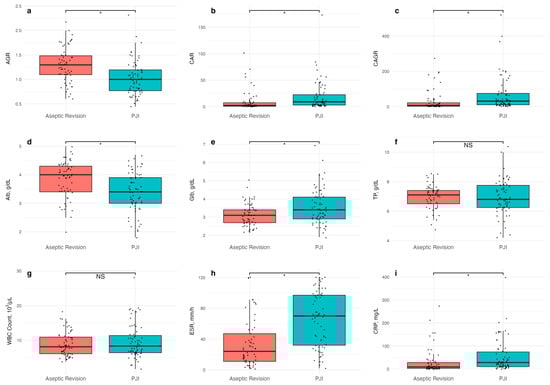- Ji, W.; Liu, Z.; Lin, T. Diagnostic value of albumin/fibrinogen ratio and C-reactive protein/albumin/globulin ratio for periprosthetic joint infection: A retrospective study. PeerJ 2023, 11, e16662. [Google Scholar] [CrossRef]