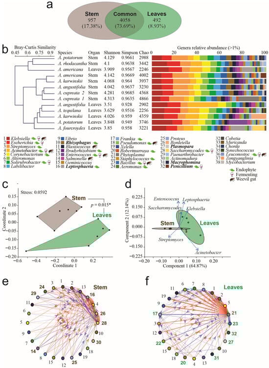 Taxonomic analysis of endophytes in agave leaves and stems. (a) Venn diagram of genera by tissue. (b) Bray–Curtis clustering of microbial communities, alpha diversity indices, and relative abundance of genera > 1% by sample. Legend names in plain text correspond to bacteria, names in bold correspond to fungi. Please refer to the references in Supplementary File S1 for previous reports of genera as endophytes, fermenters, or isolated from weevils’ gut. (c) Non-Metric Multidimensional Scaling (NMDS) analysis of genera by compartment. Connecting lines between polygons correspond to the p-value obtained by PERMANOVA analysis. (d) Principal Component Analysis (PCA) of genera by compartment. (e) Interaction networks in leaves. (f) Interaction network in stems. In networks, thickness corresponds to interaction strength, whereas color indicates red = positive interactions; blue = negative interactions, and the arrow indicates the interaction direction. Arial bold numbers correspond to genera that participate exclusively in each network (* = p < 0.05). Numbers in bold Arial correspond to the genera participating exclusively in each network.